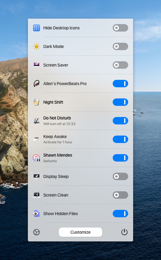U vybraných možností si můžete zobrazit také různá dodatečná nastavení. Stačí, abyste na možnosti najeli kurzorem, a poté v pravé části klepnuli na ikonu šipky. Po kliknutí se vám zobrazí dodatečné nastavení, u možnosti Keep Awake (režim proti uspání Macu) si můžete například dobu, po kterou bude tento režim aktivní. Výše uvedeným seznamem možností to ale nekončí, jelikož pokud zvolíte v rozhraní aplikace možnost Customize, tak si můžete nastavit další možnosti pro rychlý přístup. Přesněji se jedná o tyto možnosti: