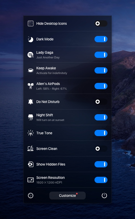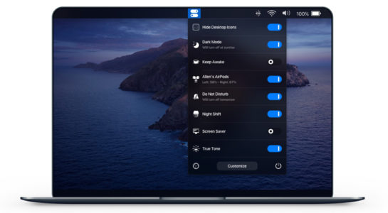 Aplikace One Switch pro macOS je velmi jednoduchá. V horní liště vám dokáže prostřednictvím jedné ikony zobrazit prakticky veškeré nastavení, které můžete během dne různě nastavovat. Najdete zde například možnosti pro (de)aktivaci True Tone, Night Shiftu, režimu nerušit, režimu proti uspávání a další – konkrétně se na všechny možnosti podíváme v dalším odstavci. Zkrátka a jednoduše, pokud nechcete mít nainstalovaných hned několik aplikací a nepořádek v horní liště, tak se vám One Switch bude zaručeně hodit.