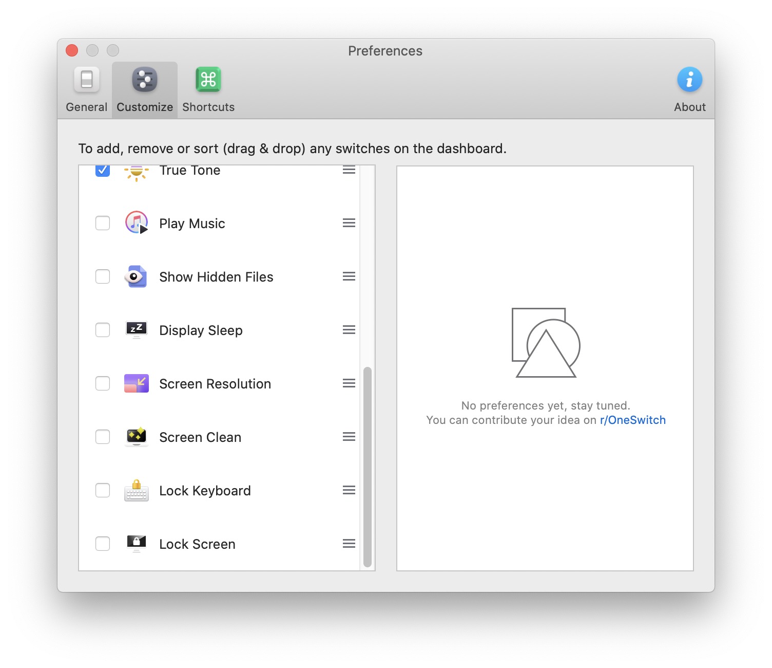 Samozřejmostí je také jednoduchá změna pořadí, a to jednoduchým přetažením v Customize menu. V nastavení dále najdete možnost pro aktivaci automatického zapnutí aplikace po přihlášení, anebo možnost pro změnu ikony v horní liště. Zajímavou sekcí v nastavení jsou také Shortcuts, tedy zkratky. Ke každé z možností si můžete jednoduše vytvořit klávesovou zkratku, díky které můžete provádět rychlé vypínání či zapínání určité možnosti. Pokud vás aplikace One Switch zaujala, můžete si ji vyzkoušet v rámci týdenní zkušební verze. Poté si můžete aplikaci zakoupit za pouhých 5 dolarů. One Switch funguje jen na macOS 10.14 Mojave a novějším.