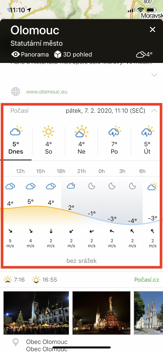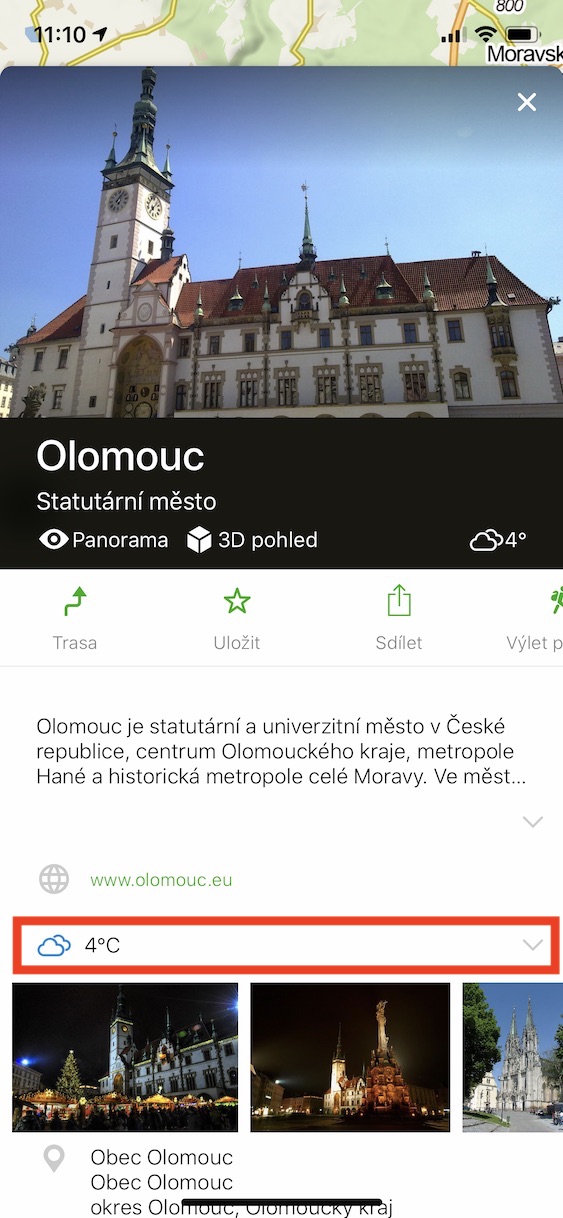 Chystáte se na výlet a chcete se předem připravit na podmínky, které budou panovat v cílové destinaci? Mapy od Seznamu vám v tomhle případě mohou pomoci. Stačí, abyste si pomocí vyhledávače našli místo, na které se chystáte, a poté v dolní části obrazovky na místo klepnuli, aby se o něm zobrazily kompletní informace. Zde poté stačí klepnout na rozbalovací sekci počasí. Rázem se vám zobrazí kompletní předpověď se stupni a povětrnostními podmínkami. Podobně to funguje i při plánování trasy. Pokud začnete plánovat trasu, a poté sjedete níže, můžete si aktivovat funkci Počasí na trase. Díky této funkci se vám zobrazí teplota, srážky nebo vítr v mapě podél trasy.