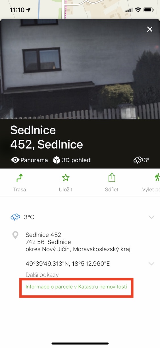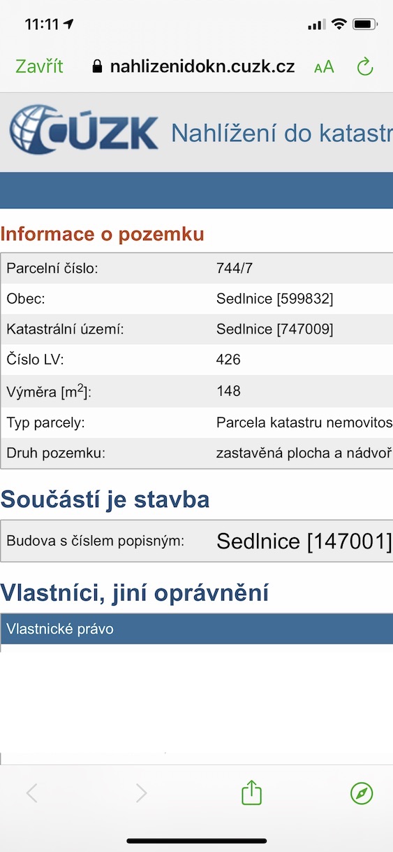 Tuto funkci nejspíše nebudete využívat každý den, ale v některých situacích se může zajisté hodit. V Mapách od Seznamu si můžete jednoduše u určitého pozemku zobrazit výpis z katastru nemovitostí. Výpis zobrazíte jednoduše tak, že do vyhledávacího pole napíšete přesnou adresu pozemku, a poté ji vyhledáte. Pak už jen stačí zobrazit veškeré informace o pozemku, a poté kliknout na malý zelený text Informace o parcele v Katastru nemovitostí na samotném spodku informací. Informace se vám poté zobrazí na stránce Nahlížení do katastru nemovitostí. Pro zavření stačí klepnout v levém horním rohu na Zavřít.