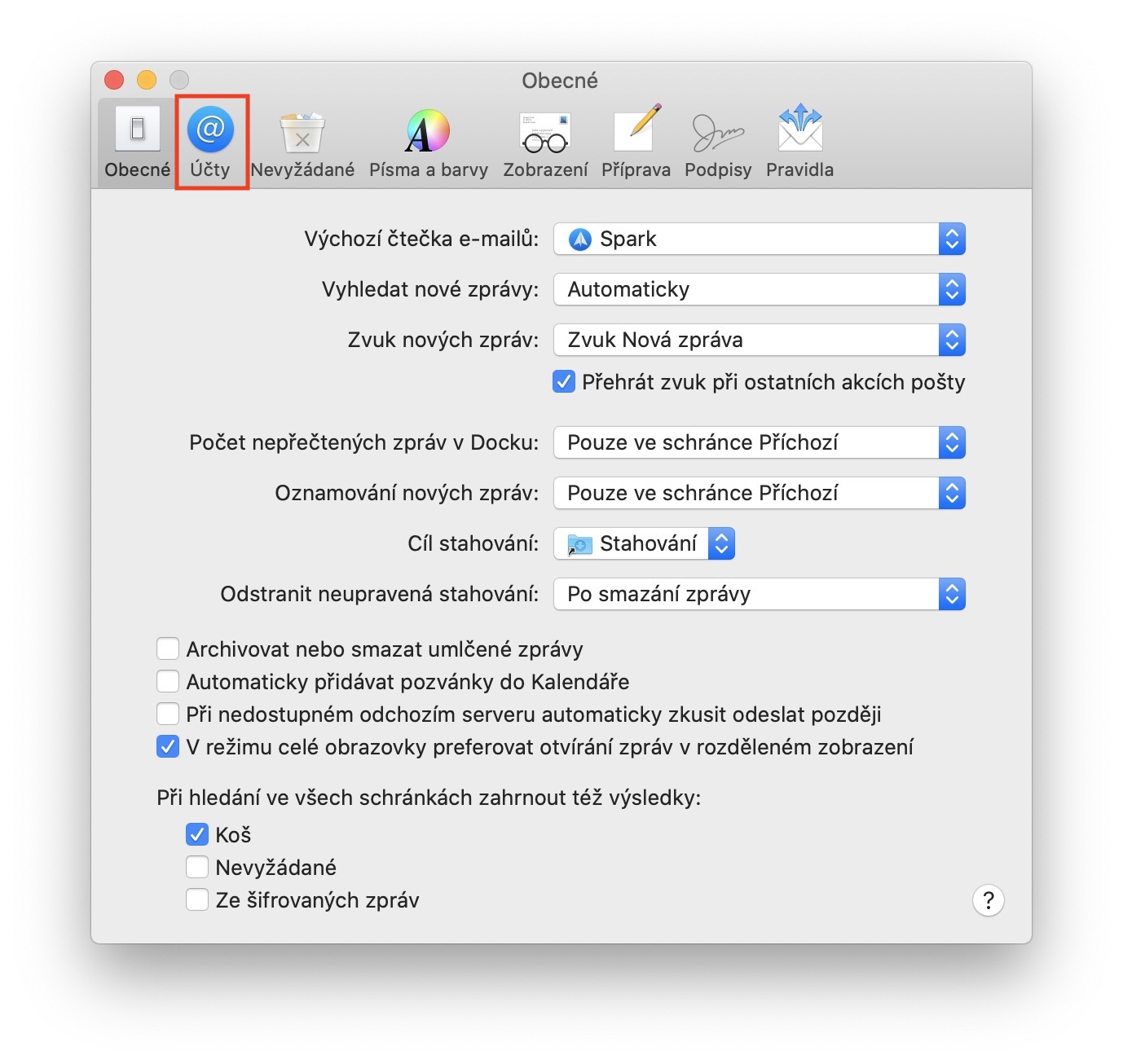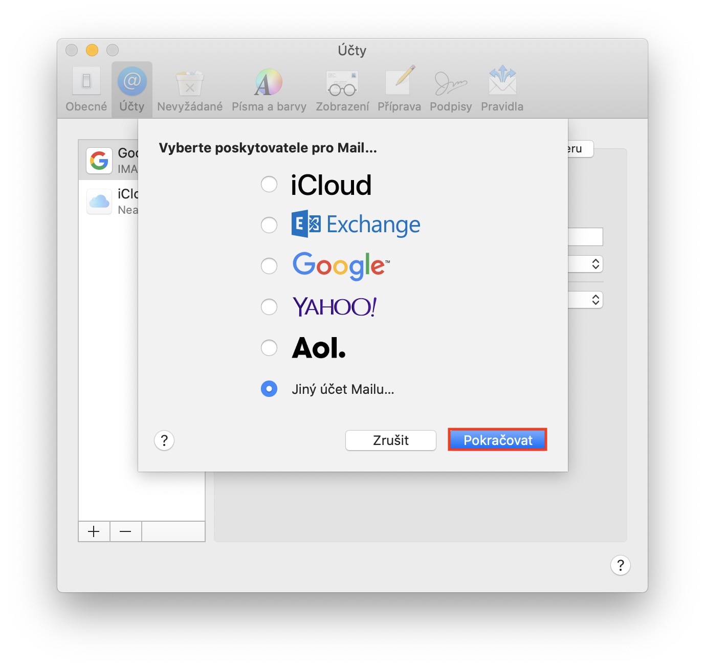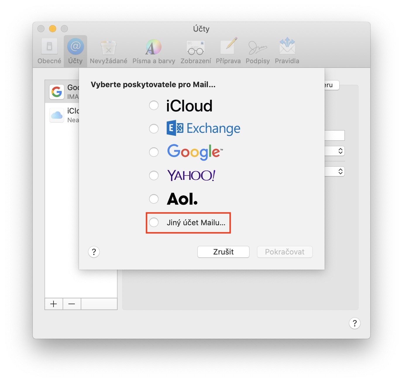 Nejprve je samozřejmě nutné, abyste na Macu otevřeli nativní aplikaci Mail, anebo se přesunuli do jeho aktivního okna. Jakmile tak učiníte, tak v horní liště klepněte na záložku Mail, a poté z rozbalovacího menu vyberte možnost Předvolby… V novém okně, které se zobrazí, se v horním menu přesuňte do sekce Účty. Zde stačí, abyste v levém dolním menu klepnuli na ikonu +. Z dalšího okna poté zaškrtněte Jiný účet mailu… a klikněte na tlačítko Pokračovat. Nyní si e-mailový účet pojmenujte, a poté do textového pole E-mailová adresa zadejte celé znění e-mailové adresy, například tedy paveljelic@outlook.com. Do textového pole Heslo poté zadejte heslo k vaší e-mailové stránce. V tomto případě by vám měl účet ihned naskočit, avšak pokud se tak nestane, tak je nutné nastavit protokol a servery příchozí a odchozí pošty.