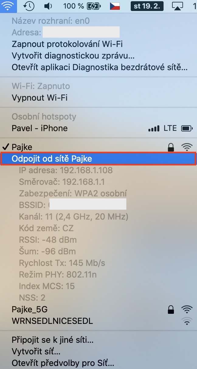 Pokud se chcete na Macu či MacBooku pouze odpojit od Wi-Fi sítě, tak je postup velmi jednoduchý. Stačí, abyste kurzorem najeli v horní liště na ikonu Wi-Fi a podrželi klávesu Option. Jakmile budete klávesu Option držet, tak na ikonu Wi-Fi klepněte. Poté, co se zobrazí rozbalovací menu, tak Option pusťte. Zobrazené rozbalovací menu se oproti klasickému menu výrazně liší. Pro odpojení od Wi-Fi sítě, ke které jste momentálně připojení, stačí, abyste zvolili možnost Odpojit od sítě [název sítě]. Tímto dojde ke klasickému odpojení od Wi-Fi sítě a nevypnete tak celý Wi-Fi modul.