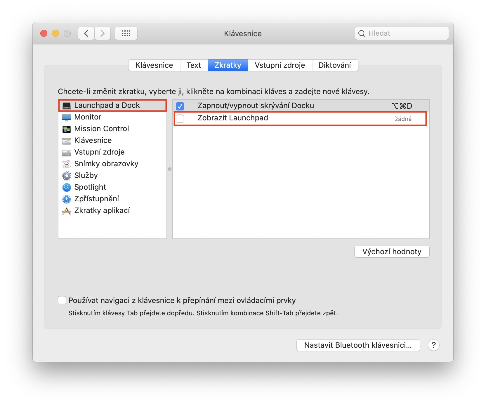 Pro deaktivaci zkratky určené pro otevření Launchpadu klikněte v levém horním rohu obrazovky na ikonu , a poté z rozbalovacího menu vyberte možnost Předvolby systému… V novém okně, které se zobrazí, rozklikněte možnost Klávesnice a v horním menu se přesuňte do sekce Zkratky. Zde už jen stačí, abyste se v levém menu přesunuli do záložky Launchpad a Dock, kde stačí jednoduše odškrtnout možnost Zobrazit Launchpad. V případě, že jste měli pro spuštění Launchpadu nastavenou nějakou zkratku, tak tímto způsobem jste ji deaktivovali.