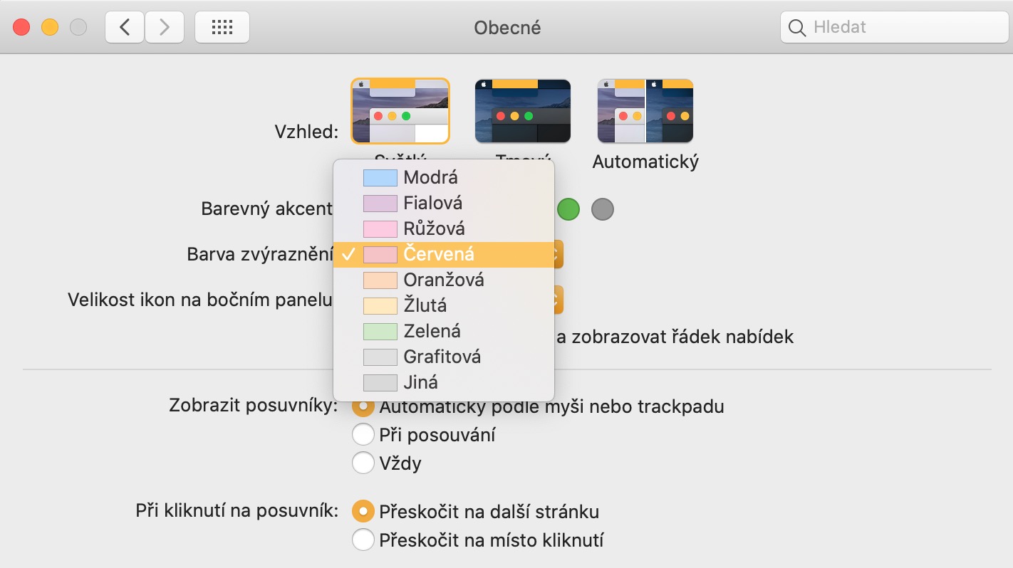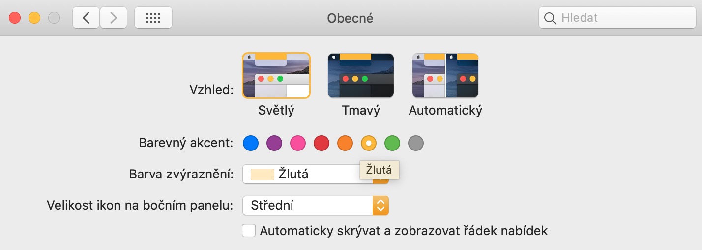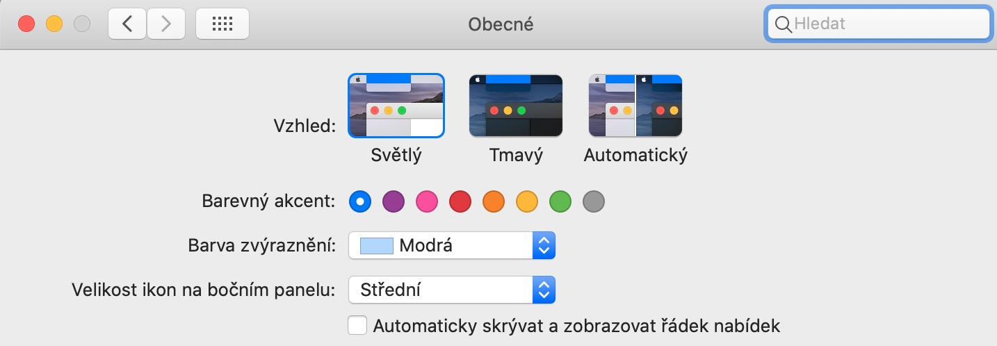 S příchodem operačního systému macOS Mojave umožnila společnost Apple uživatelům sladit uživatelské rozhraní na svém Macu do předem nastavených i vlastnoručně navolených barevných schémat. Pokud jste tuto možnost ještě nikdy nevyzkoušeli, zkuste jí dát možnost – budete možná překvapeni, jak dokáže barevné schéma ovlivnit vzhled vašeho Macu. I v tomto případě klikněte na menu -> Předvolby systému -> Obecné. Zde můžete zvolit barevný akcent, vybrat barvu zvýraznění a nastavit další drobnosti, díky kterým získá rozhraní vašeho Macu svůj unikátní vzhled. Pokud máte na svém Macu nainstalovaný kompatibilní operační systém, můžete zde také nastavit přepínání světlého a tmavého režimu.