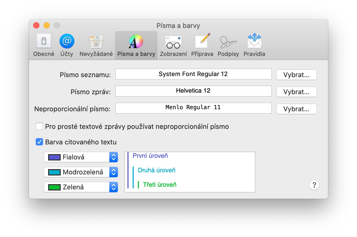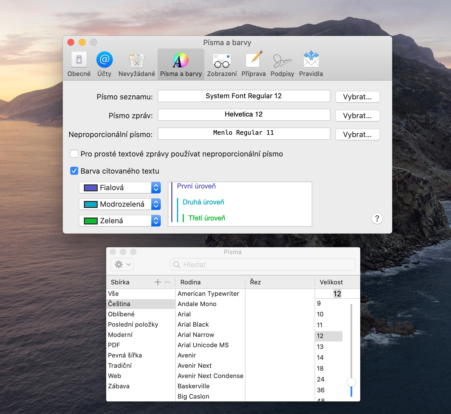 Kromě vzhledu uživatelského rozhraní jako takového si můžete na svém Macu přizpůsobit také vzhled jednotlivých aplikací, a to jak těch nativních, tak i některých aplikací třetích stran. Poměrně bohaté možnosti přizpůsobení barev a písma nabízí například nativní aplikace Mail – stačí ji spustit, v nástrojové liště v horní části obrazovky zvolit název aplikace -> Předvolby -> Písma a barvy. Přizpůsobit si můžete i Terminál. Spusťte aplikaci, v horní nástrojové liště klikněte na název aplikace -> Předvolby -> Profily, kde si vyberete profil, který se vám líbí. Poté klikněte na kartu Obecné a v horní části v rozbalovacím menu vyberte název profilu, který chcete nastavit.