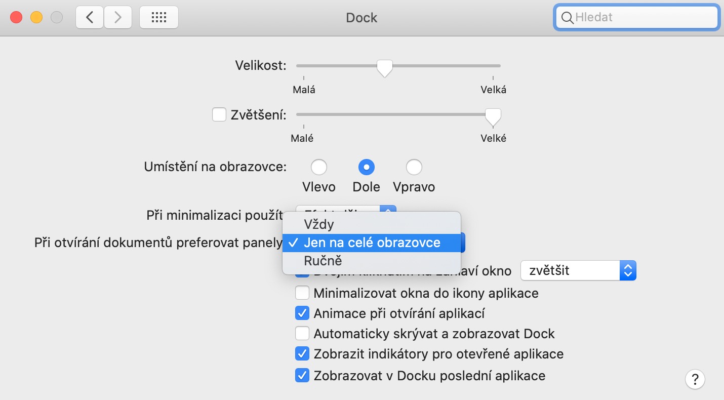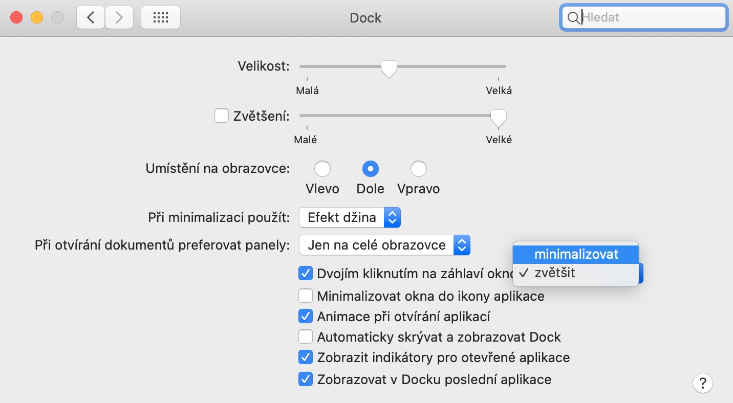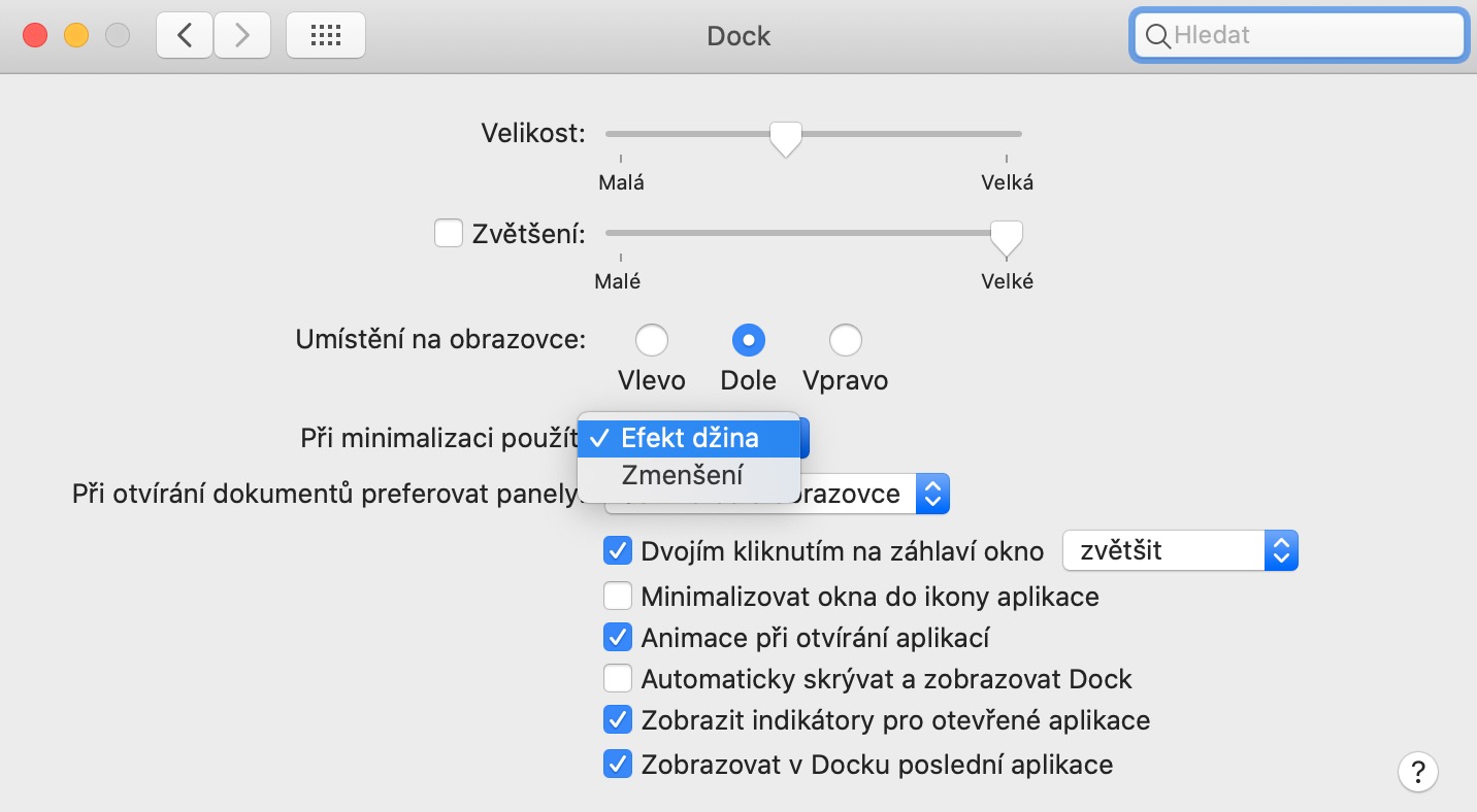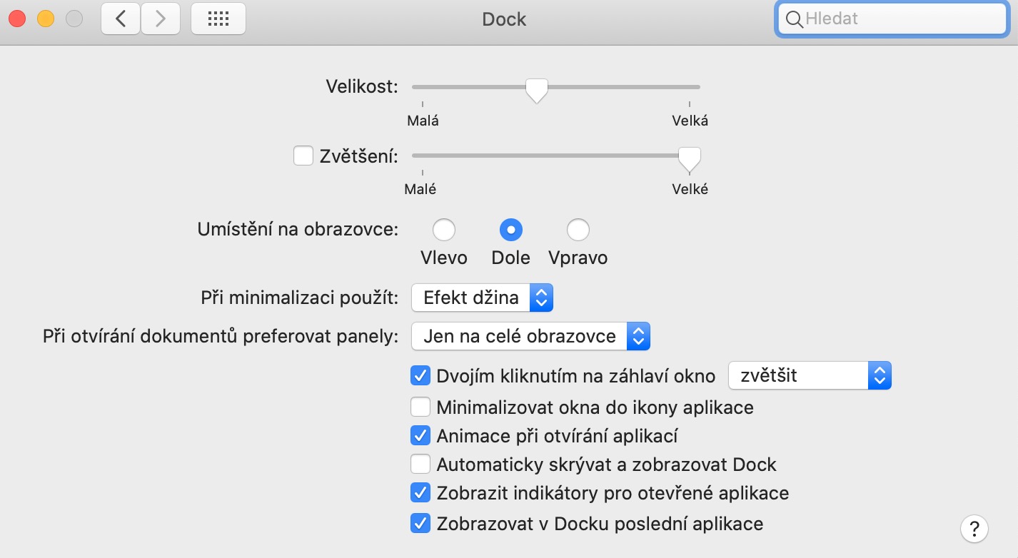 Pokud si chcete přizpůsobit i Dock, nabízí vám Předvolby systému řadu možností. Ze všeho nejdříve byste si měli promyslet, které aplikace ve svém Docku zkrátka mít nechcete, a jednoduše je odsud odstraňte přetažením a potvrzením odstranění. Poté spusťte Fider, zamiřte do složky Aplikace a odsud do Docku přesuňte ikonky aplikací, které zde chcete mít. V menu -> Předvolby systému -> Dock zase můžete přizpůsobit zobrazování a případné skrývání Docku, jeho pozici na monitoru, efekty, velikost a řadu dalších parametrů.