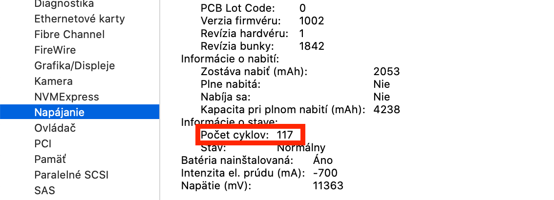 V prvom rade batérie vždy treba používať, nerobí im dobre pokiaľ sú stále len na nabíjačke alebo nebodaj dlhodobo vybité. Určite si vravíš, čo to znamená používať, odporúčam ročne “nabehať” aspoň 100 nabíjacích cyklov. Vždy sa pousmejem, keď vidím inzerát: Macbook vo výbornom stave, 2 ročný, 60 nabíjacích cyklov. Počet nabíjacích cyklov zistíte: / O tomto počítači Mac / Hlásenie o systéme / Napájanie a tak je položka Počet cyklov. Ako môžete vidieť, môj Macbook Air ktorý používam ako druhý stroj, má po niečo vyše roku 117 nabíjacích cyklov.