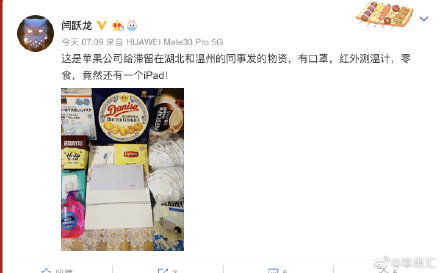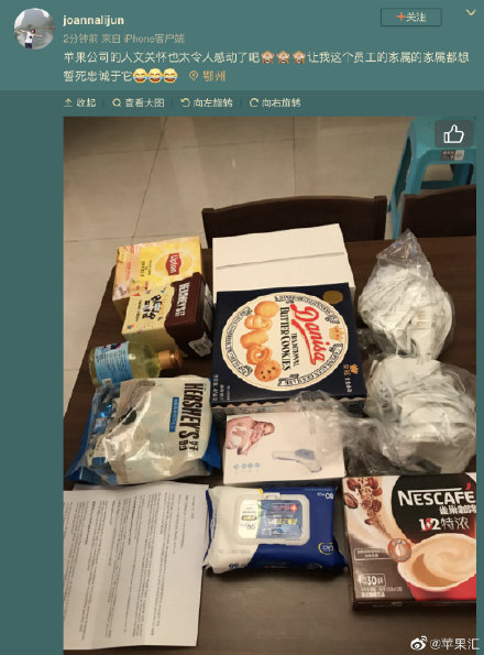 Zaměstnancům uvízlým v karanténě v Číně poslal Apple iPad, roušky, sladkosti, čaje, teploměr, kávu, dezinfekční prostředky a pár dalších drobností. K tomuto balíčku přiložil i dopis s textem: „Naší vážení kolegové v provincii Hubei a městě Wenzhou, doufáme, že vás tento dopis zastihne ve zdraví. Od poslední komunikace s Vámi víme, že jste v této situaci všichni silní. Rozumíme obtížím, kterým čelíte a rádi bychom Vám a Vaší rodině poskytli co nejlepší podporu. Víme, že provincie Hubei a město Wu-chan jsou nejvíce zasaženy koronavirem, který si vyžádal v Číně už 2835 životů. Za celý Apple tým vám posíláme vše nejlepší spolu s CareKitem pro Vás a Vaši rodinu. V balíčku naleznete předměty a iPad, který lze použít k online učení dětí nebo ke zkrácení dlouhých chvil doma. Kromě toho jsme pro vás přichystali řadu poradenských a konzultačních služeb, které Vám v těchto chvílích pomohou.“