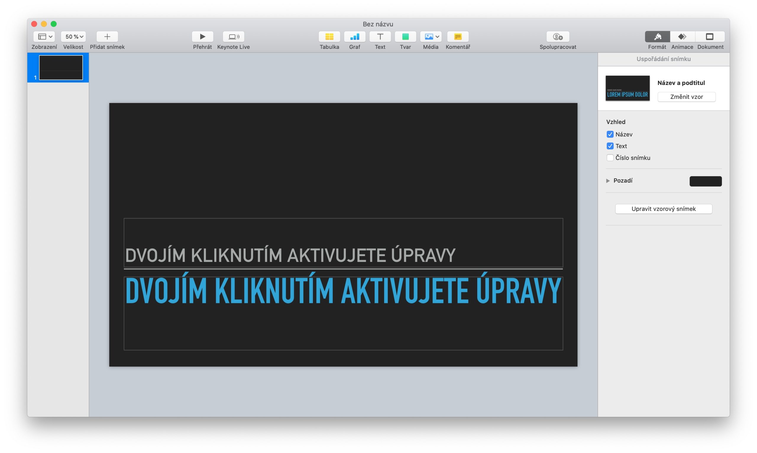 Pevně věříme, že přidat snímek do prezentace s přehledem zvládne opravdu každý. Prázdný snímek jednoduše přidáte kliknutím na tlačítko “+” v levém horním rohu. Další možností je položka “Snímek” v horní nástrojové liště. Každý nově přidaný snímek se zobrazí v liště po pravé straně (navigátor snímků), kde můžete jednotlivé snímky vzájemně prohazovat, mazat je, duplikovat a dále s nimi pracovat. Snímky můžete v Keynote také přenášet z jedné prezentace do druhé – stačí otevřít obě prezentace vedle sebe. V navigátoru snímků kliknutím vyberte snímky, které chcete přesunout, a jednoduše je přetáhněte do druhé prezentace, kde je pak už můžete upravovat a přesouvat podle potřeby.