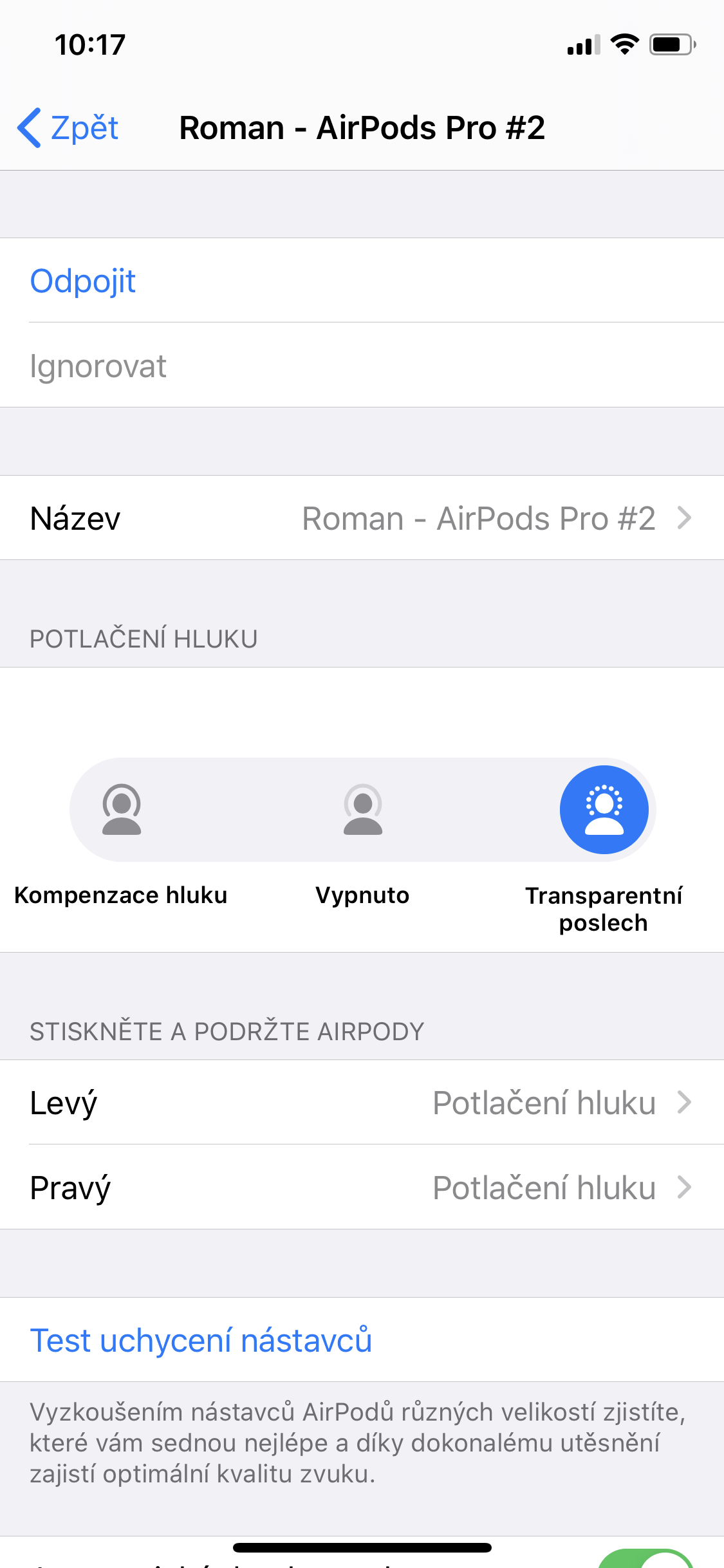 Vše funguje 1:1 stejně jako u pravých AirPods Pro a dokonce i v nastaveních sluchátek jsou možnosti, jako otestovat těsnost v uších kvůli aktivaci Noise Cancelingu nebo režimu propustnosti. Oba režimy je možné v nastavení aktivovat, ovšem ani jeden z nich v praxi nic neudělá a sluchátka hrají pořád stejně. Mimochodem, když jsme u zvuku, mohli bychom se na něj podívat trochu podrobněji. Sluchátka totiž hrají překvapivě velmi dobře a rozdíl oproti pravým AirPods, co se kvality zvuku týče, sice poznáte, ale není nějak extra výrazný. Funguje dokonce i mikrofon a kvalita záznamu je opět velmi podobná té, kterou nabízí skutečné AirPods Pro.