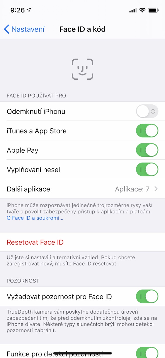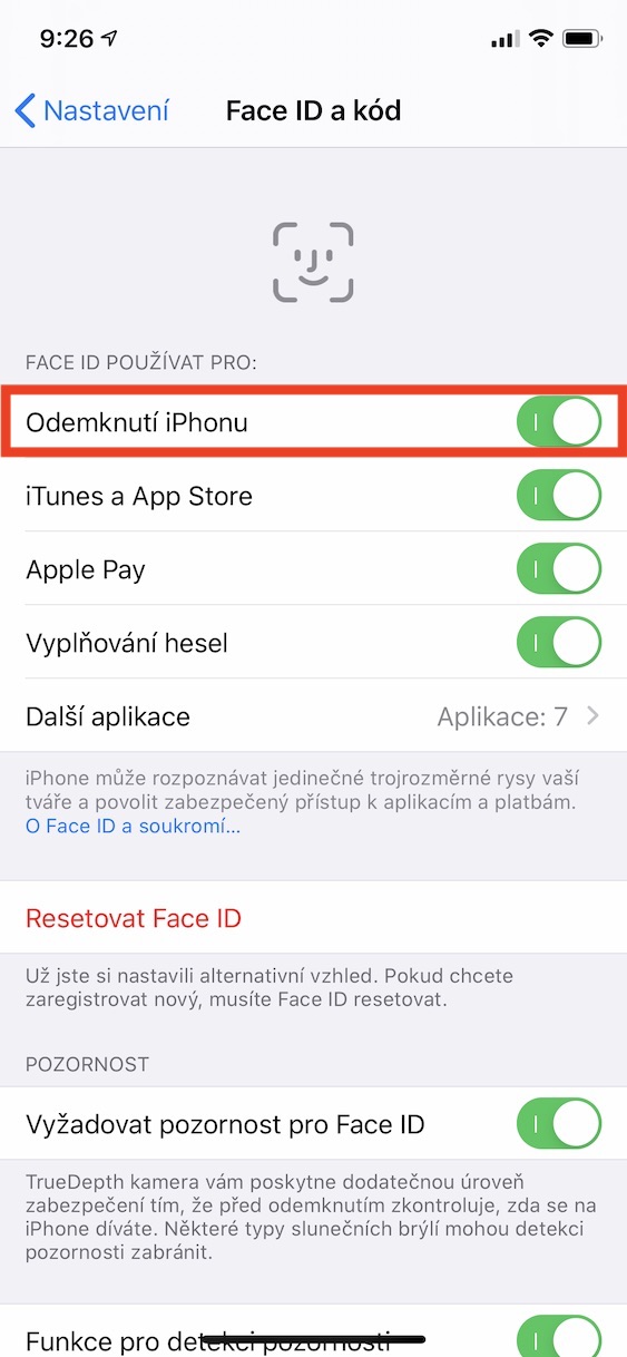 Odpověď zní velmi jednoduše – můžete se vrátit k využívání klasického kódového zámku. Ten samozřejmě můžete využít i tehdy, kdy máte Face ID aktivní, avšak v tomto případě se iPhone vždy pokusí zařízení pomocí Face ID odemknout, a až poté vám dá možnost využití kódu, což zabere několik sekund navíc. Pro urychlení fungování lze tedy Face ID kompletně vypnout a aktivovat pouze kódový zámek. V tomto případě stačí otevřít nativní aplikaci Nastavení, kde se přesuňte do sekce Face ID a kódový zámek. Zde stačí zadat váš kódový zámek a pomocí přepínače deaktivovat možnost Odemknutí iPhonu. Deaktivovat můžete také další možnosti, kdy má či nemá dojít k využití Face ID, avšak venku s rouškou budete nejčastěji využívat právě odemykání.