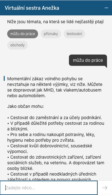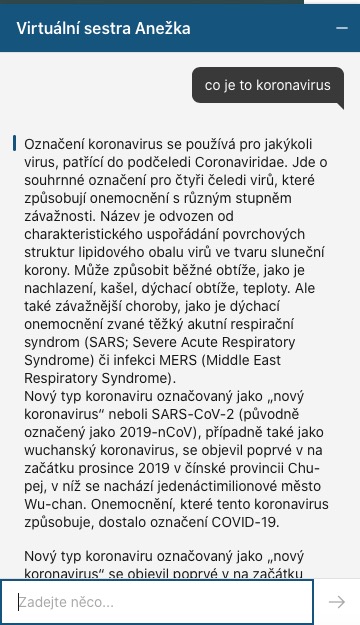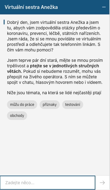 Anežka bude na webu Ministerstva zdravotnictví k dispozici 24 hodin denně 7 dní v týdnů a to zřejmě až do úplného vymýcení pandemie. Postupem času se má zdokonalovat a díky tomu být čím dál využitelnější. Nicméně už nyní vám dokáže odpovědět na obrovské množství dotazů, které mnohdy nesnesou odklad. Pokud vás tedy podobné technologie zajímají či potřebujete získat informace o koronaviru, Anežku na webu ministerstva navštivte. Naleznete jí přímo na mikrostránce věnované koronaviru pod bublinou chatu v pravém spodním rohu displeje.