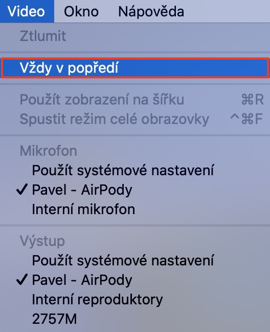 Nejprve je nutné, abyste se samozřejmě přesunuli do aktivního okna aplikace FaceTime. Jakmile tak učiníte, tak už je postup velmi jednoduchý. Buď před, anebo při video hovoru stačí, abyste v horní liště klepnuli na záložku s názvem Video. Jakmile tak učiníte, tak se zobrazí rozbalovací menu, ve kterém stačí zaškrtnout možnost Vždy v popředí. V případě, že budete chtít tento režim ukončit, tak stačí provést stejný postup a možnost Vždy v popředí ukončit. Ne vždycky se totiž aktivace této možnosti hodí. V záložce Video si poté můžete kromě zobrazení v popředí nastavit zobrazení na šířku, anebo třeba na celé obrazovce.