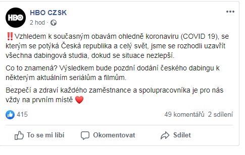 A máme zde další omezení, které zařídila současná pandemie koronaviru. HBO na svých facebookových stránkách informovalo, že vzhledem k současné situaci jsou nuceni uzavřít veškerá dabingová studia, což bude mít za následek pozdější dodání českého znění k některým aktuálním seriálům. Celé sdělení může vidět níže.