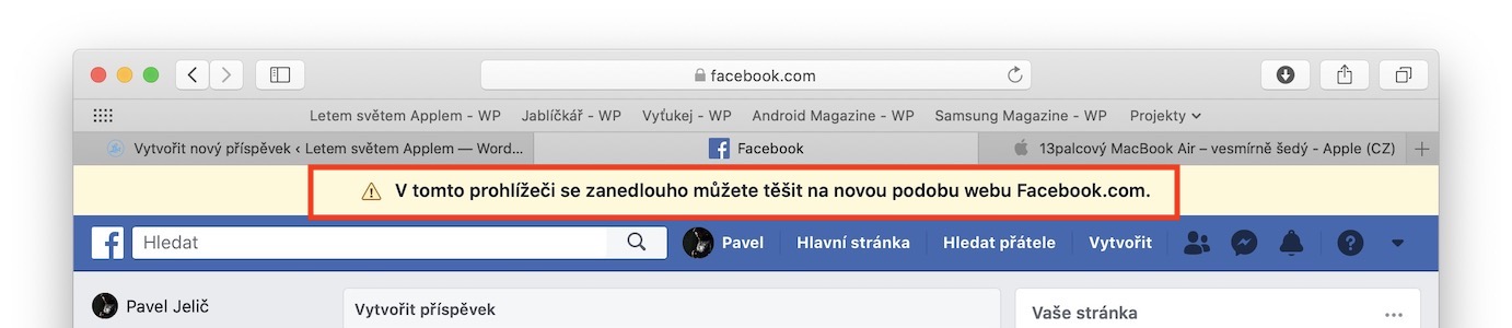 Tak jako tak byste si ale na novou verzi měli začít zvykat, jelikož ji Facebook během několika dalších měsíců nasadí natvrdo, a to bez možnosti vrátit se zpět. Tím, že na svém profilu v Google Chrome aktivujete nový vzhled, tak si zaručíte, že v den, kdy bude vzhled k dispozici také pro Safari, dojde zde k jeho automatické aktivaci. Když se totiž přesunete z Google Chrome zpět do Safari, tak se v horní části obrazovky zobrazí upozornění: V tomto prohlížeči se zanedlouho můžete těšit na novou podobu webu Facebook.com. Uživatelům Safari tedy v tomto případě nezbývá nic jiného, než vyčkat, anebo na malou chvíli začít používat Google Chrome. Doufejme, že vzhled Facebooku zůstane čistý a především poté plynulý i po dobu dalších let.