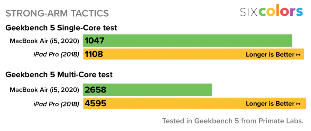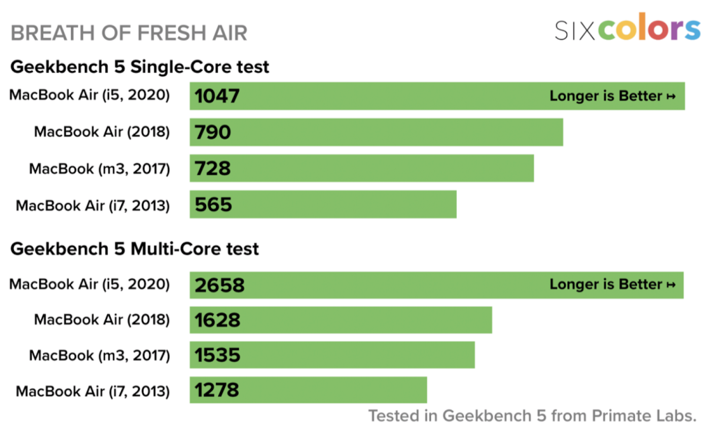 O první detailnější pohled na výkon stroje se zasloužil Jason Snell z portálu Six Colors, kterému se dostal do rukou konkrétně model osazený čtyřjádrovým procesorem Intel Core i5 10. generace s taktem 1,1GHz a Turbo Boostem 3,5GHz. Ten si lze nakonfigurovat už za 32 990 korun, přičemž za tuto cenu nabízí 8 GB RAM a 256GB SSD disk. Takto nakonfigurovaný MacBook Air tedy stojí stejně jako základní model Air (2019) při jeho vstupu na trh. Ten však nabízel v základu “jen” 128GB SSD a dvoujádrový procesor Intel Core i5 8. generace s taktem 1,6GHz a Turbo Boostem 3,6GHz (stejně jako model z roku 2018). Cena je však ve výsledku jednou z mála věcí, ve které se mohou tyto dva stroje rovnat. Ve výkonnostních testech totiž roznesl letošní model svého loňského předchůdce doslova na kopytech.