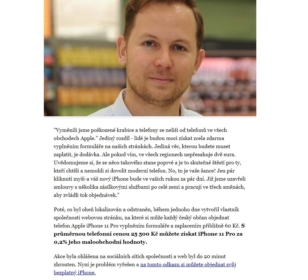 Internetové podvody nezbrzdila ani pandemie koronaviru, se kterou se v posledních týdnech potýká takřka celý svět. Svědčí o tom i nynější pokus podvodníků šířící se po tuzemských sociálních sítích tvářící se jako zpráva tuzemského portálu Novinky.cz o rozdávání iPhonů zdarma.