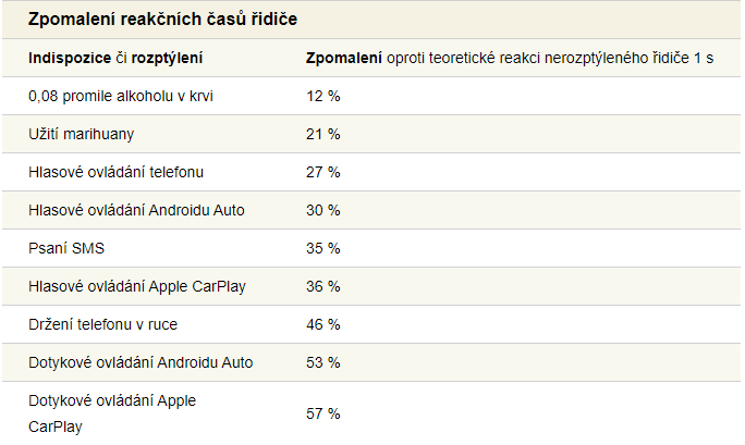 Zatímco Android Auto, tedy speciální operační systém na bázi Androidu uzpůsobený automobilům, prodloužil tuto reakční dobu o 53%, Apple CarPlay si na konto připsal až o 57% delší prodlevu. Jak můžete vidět v tabulce, konkurence drtí jablečný systém jak z hlediska ovládání dotykem, tak hlasem. I tak se však nejedná o příliš dobré výsledky a je vidět, že oba systémy nesou i přes mírné rozdíly obdobné riziko. Jedinou nevýhodou studie je tak absence porovnání s nativními infotainmenty nejrůznějších značek, které často ovládání hlasem vůbec nepodporují a spoléhají výhradně na ruční zadávání dat. Například s Android Auto lze komunikovat pomocí příkazu „Ok, Google“, po jehož vyslovení stačí vybrat některou z možností a systém za vás kupříkladu automaticky nastaví navigaci nebo vytočí žádané číslo. Analýza si posvítila také na odchýlení při jízdě v jednom pruhu při zadávání cíle do navigace a vyhledávání hudby. Celkem odchylka činila 0.31 metru při hlasovém ovládání a 0.47 metru při dotykovém, což se sice nezdá jako příliš, ale při husté dopravě mohou tato čísla hrát roli.