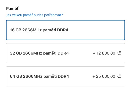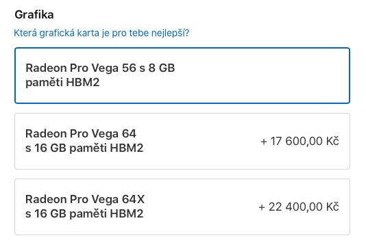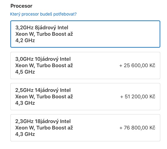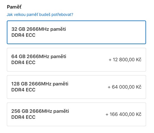 Slušného snížení ceny se dočkal i iMac Pro. Pokud jste si jej chtěli dříve osadit desetijádrovým Xeonem W, zaplatili jste za to 25 600 korun. Nyní cena spadla na 24 000 korun. Čtrnáctijádrový Xeon W vyšel dříve na 51 200 korun, nyní vyjde na 48 000 korun. Osmnáctijádrový Xeon stával dříve 76 800 korun, nyní za něj zaplatíte 72 000 korun. Co se týče RAM paměti, u 64 GB spadla cena o 800 korun na 12 000 korun, v případě 128 GB spadla cena o 4 000 korun na 60 000 koruna u 256 GB se pak bavíme o úspoře 10 400 korun, jelikož nově tato varianta vychází na 156 000 korun. Cena grafické karty Pro Vega 64 se 16 GB pamětí HBM2 spadla z 17 600 korun na 16 500 korun a cena karty Radeon Pro Vega 64X s 16 GB pamětí HBM2 spadla ze 22 400 korun na 21 000 korun.