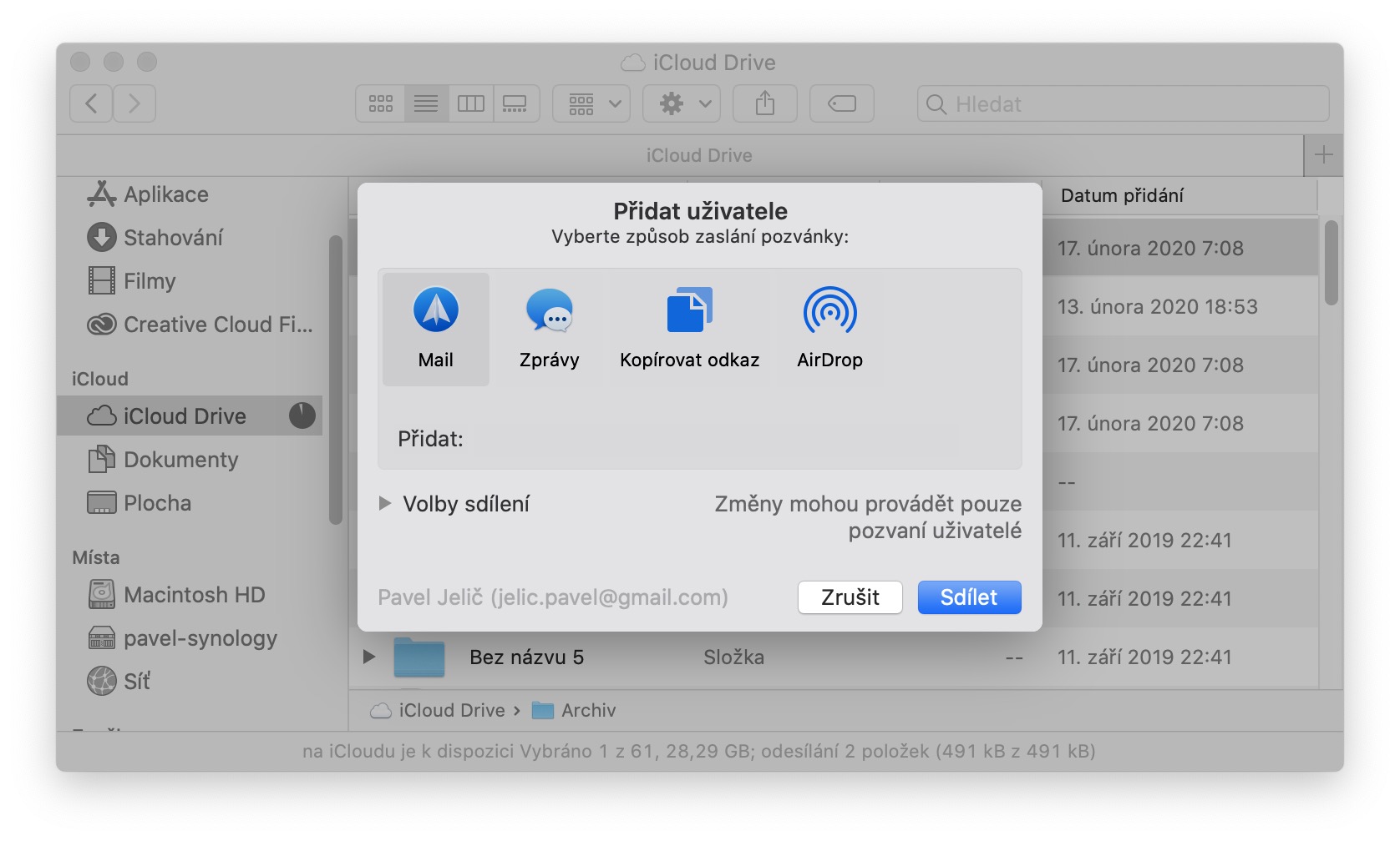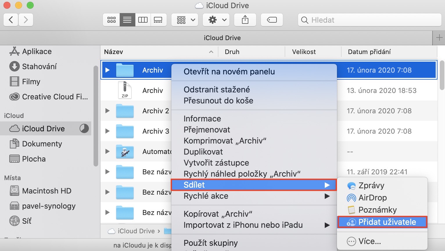 Nejprve je samozřejmě nutné, abyste váš Mac či MacBook aktualizovali na nejnovější verzi operačního systému macOS s označením 10.15.4 Catalina. Po aktualizaci už jen stačí, abyste se na vašem jablečném počítači přesunuli do Finderu. Odsud v levém menu klepněte na kolonku s názvem iCloud Drive. Jakmile tak učiníte a ocitnete se na vašem cloudovém úložišti, tak najdětě anebo vytvořte složku, kterou chcete v rámci iCloudu sdílet. Po nalezení či vytvoření složky už jenom stačí, abyste na ni kliknuli pravým tlačítkem (popřípadě dvěma prsty na trackpadu). Z rozbalovacího menu, které se zobrazí, najeďte kurzorem na kolonku Sdílení. Poté se vám otevře druhé menu, ve kterém už jen stačí zvolit možnost Přidat uživatele. Po kliknutí na tuto možnost už se zobrazí okno, ve kterém lze konkrétním uživatelům poslat pozvánku pro sdílení. Zároveň máte k dispozici možnost Volby sdílení, kde lze nastavit přístup a oprávnění uživatelů. Sdílení stačí poté potvrdit stisknutím Sdílet.