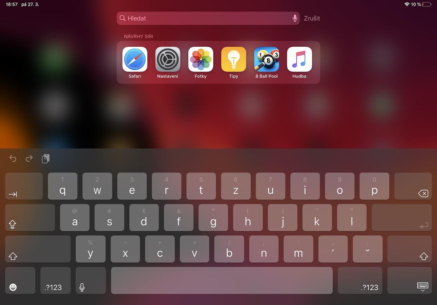 Pokud se nacházíte na domovské obrazovce, tak můžete posunutím dvou prstů seshora dolů otevřít Spotlight. To se může hodit především tehdy, kdy nemáte k iPadu připojenou klávesnici. Pomocí klávesnice totiž můžete Spotlight vyvolat kdekoliv v aplikaci stisknutím klávesové zkratky Command + mezerník.