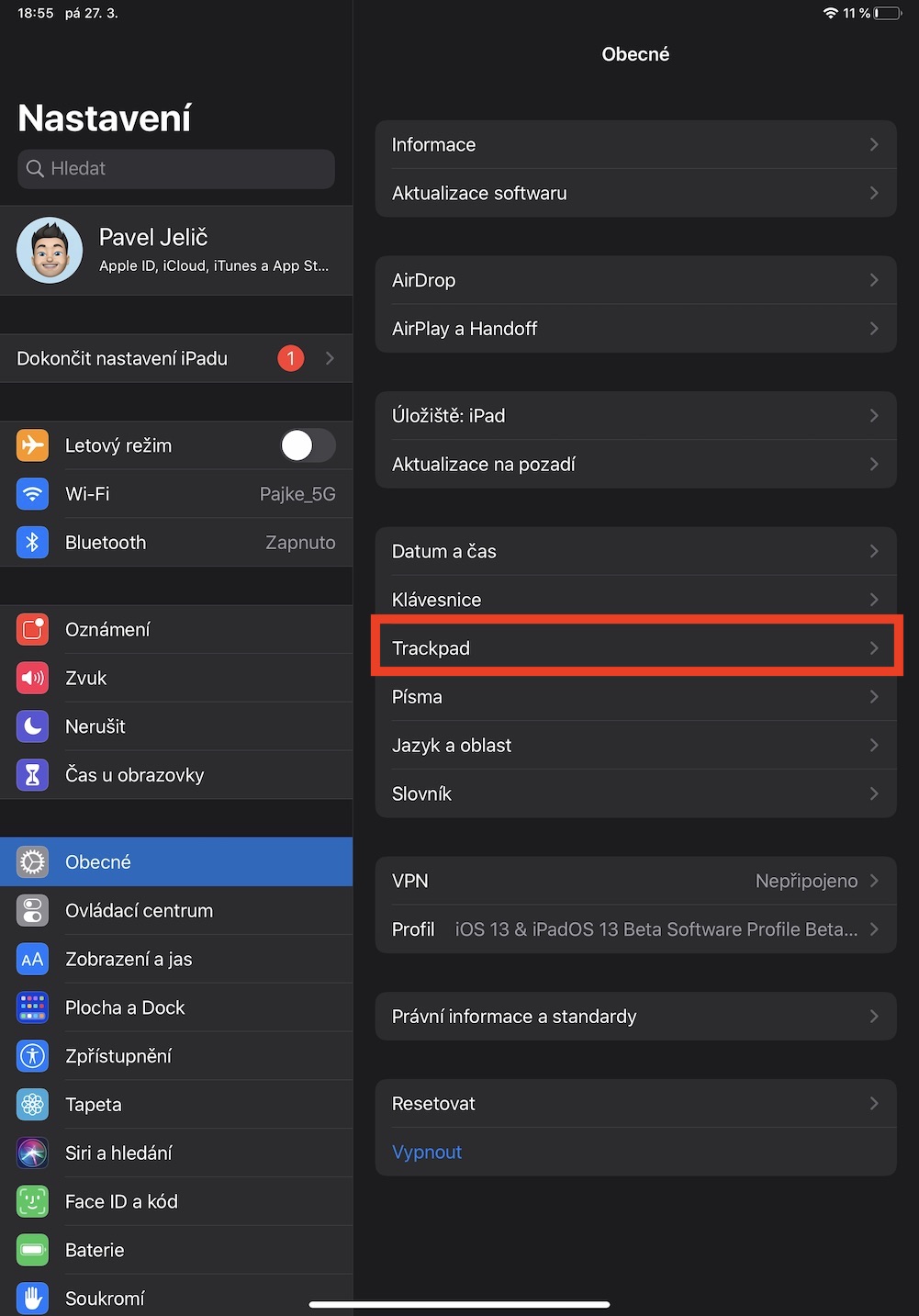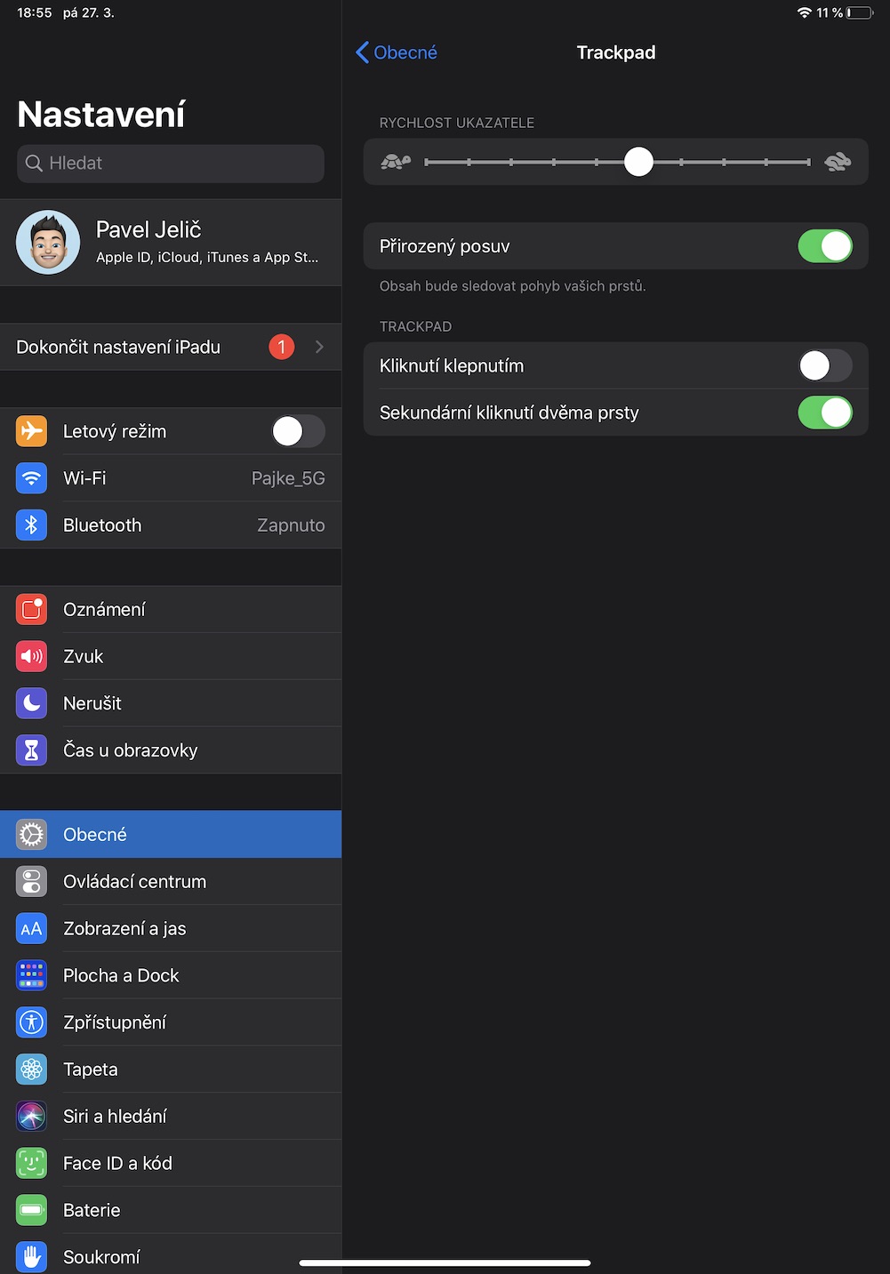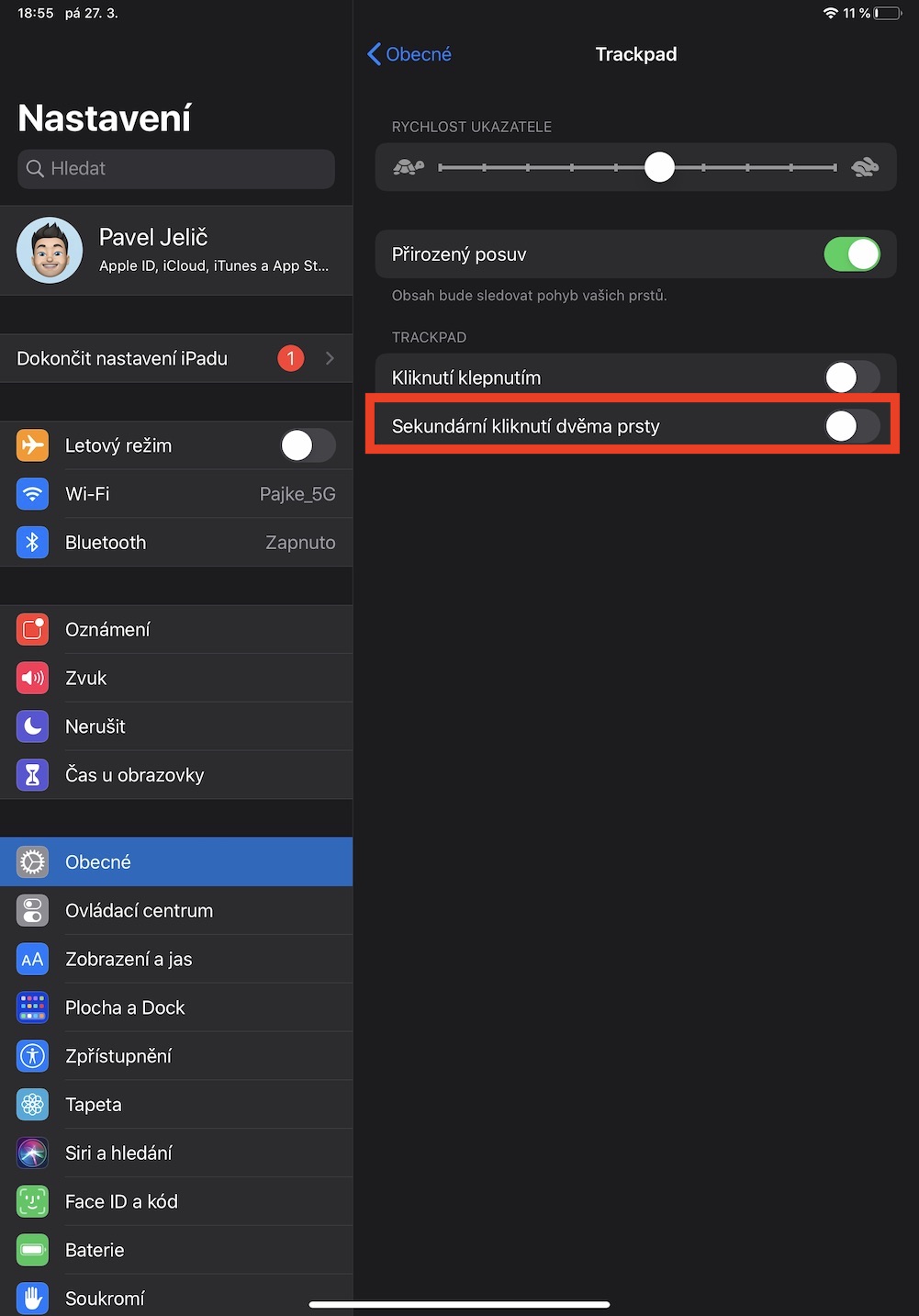 Pokud máte k vašemu iPadu připojený trackpad, tak si můžete nastavit funkci pro vyvolání akce „pravého kliknutí“ pomocí dvou prstů na trackpadu. V tomto případě stačí po připojení trackpadu přejít do Nastavení, kde rozklikněte možnost Obecné, a poté Trackpad. Zde jednoduše aktivujte možnost Sekundární kliknutí dvěma prsty. Zároveň je zde možnost pro Kliknutí klepnutím, kterou doporučuji deaktivovat. V opačném případě by totiž mohlo dojít k tomu, že budete položením dvou prstů na trackpad neustále provádět akci „pravého kliknutí“.