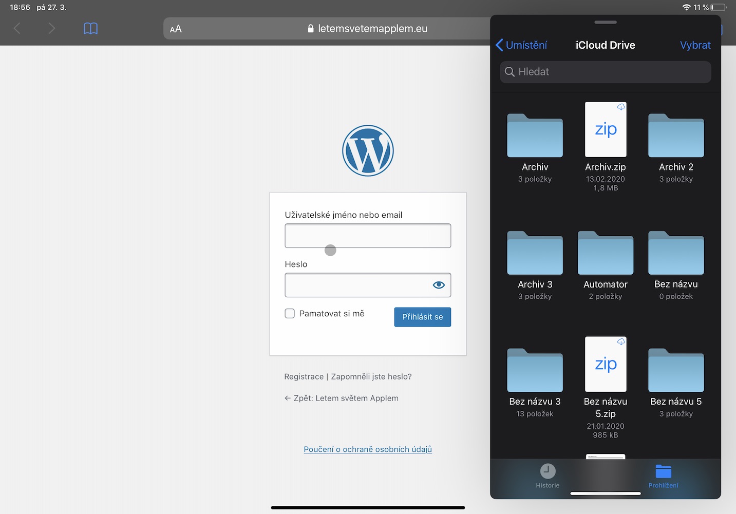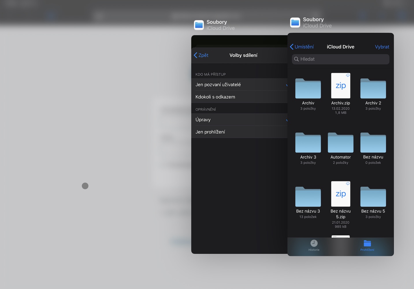 Pokud z Docku přesunete nějakou aplikaci na pravou stranu obrazovky, můžete si ji přidat do tzv. Slide Over módu. Do tohoto módu poté můžete přidat další aplikace, mezi kterými se lze jednoduše přepínat. Pokud chcete Slide Over zobrazit, tak stačí trackpadem přejet do pravé části obrazovky, a poté přejet „ještě více“ do pravé části obrazovky. Tím aplikace ve Slide Over zobrazíte a můžete s nimi pracovat.