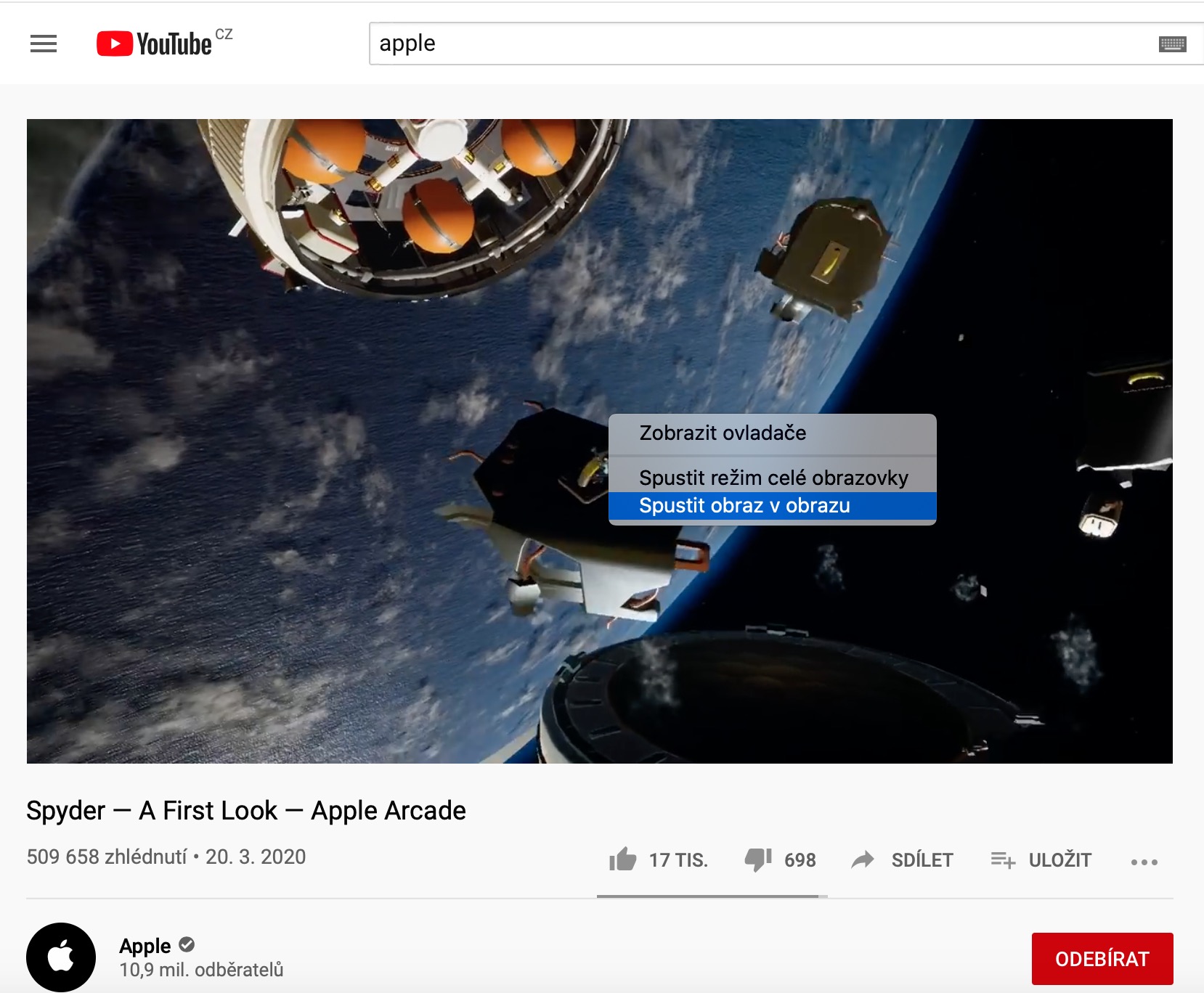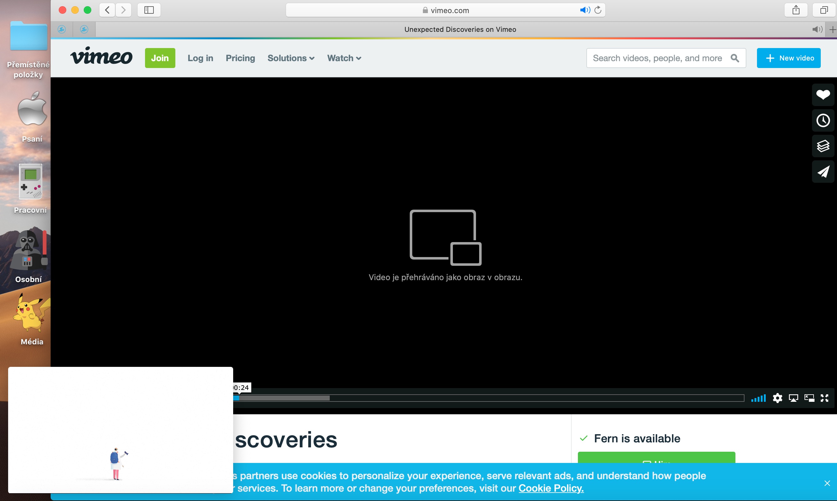 Když společnost Apple představila operační systém macOS Sierra, uživatele mimo jiné nadchla funkce obraz v obrazu pro přehrávání videí na některých stránkách ve webovém prohlížeči Safari. Podporu tohoto režimu přehrávání nabízí čím dál více webů, na každém z nich se ale tento způsob přehrávání aktivuje jinak. Zatímco na serveru YouTube musíte na zvolené video kliknout dvakrát pravým tlačítkem myši, než se vám zobrazí menu, ze kterého můžete vybrat přehrávání obrazu v obraze, na webu Vimeo můžete do tohoto režimu přejít kliknutím na příslušnou ikonku v menu ve spodní části okna s videem.