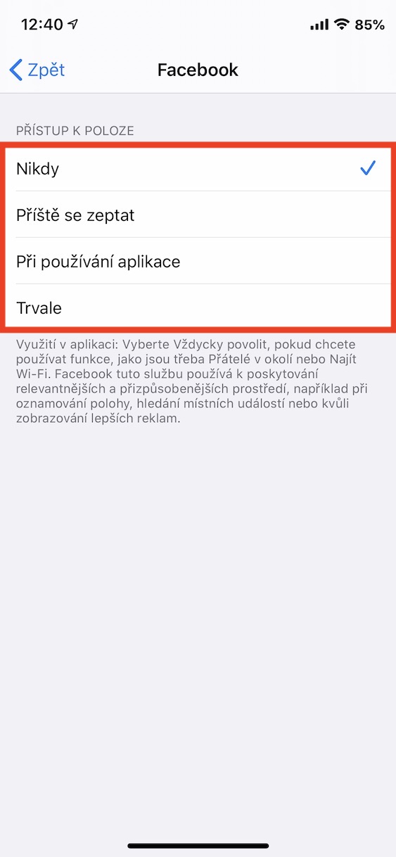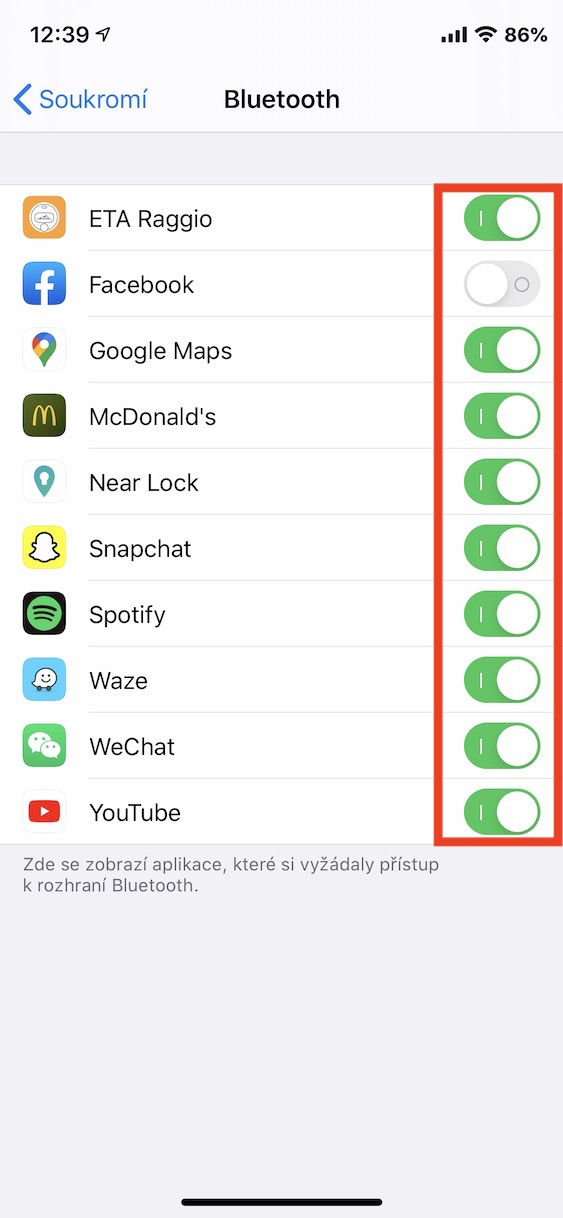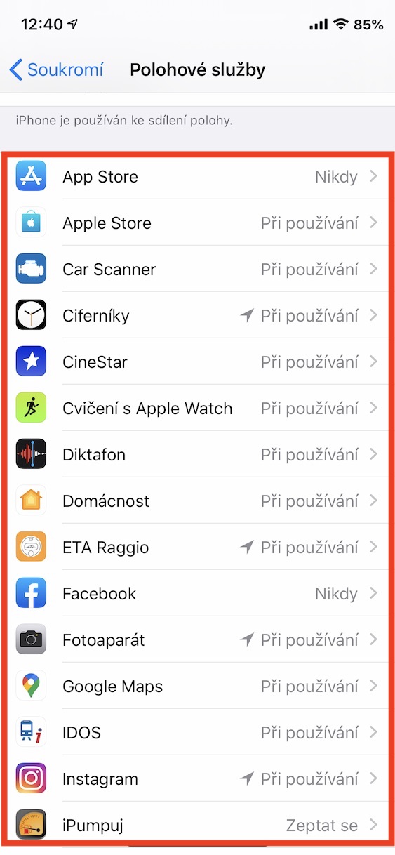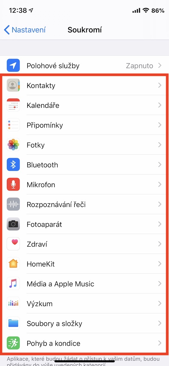 Jakmile spustíte nějakou aplikaci poprvé, tak se vám zobrazí notifikace o tom, jaké služby a funkce chce aplikace využívat. Mnoho uživatelů však tyto notifikace nečte a automaticky je potvrdí, což je samozřejmě špatně. U každé aplikace byste se měli v klidu rozhodnout, zdali jí povolíte naprosto vše, co po vás žádá. Je například nesmysl, aby aplikace v podobě navigace potřebovala přístup k vašim fotografiím. Vždy se tedy pečlivě rozhodněte a povolte jen to, co vám dává smysl. Pokud jste omylem povolili něco, co jste nechtěli, anebo pokud si chcete zkontrolovat aplikace, které mají k určitým službám přístup, tak se přesuňte do Nastavení, kde sjeďte níže a rozklikněte možnost Soukromí. Zde si poté vyberte funkci/službu, u které chcete aplikace zkontrolovat. Poté stačí aplikacím přístup pomocí přepínačů povolit či zakázat.