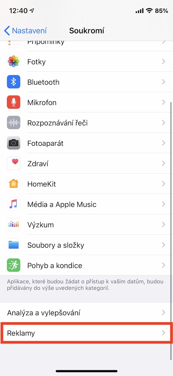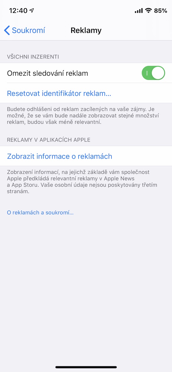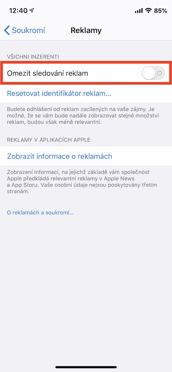 Reklamy se nachází prakticky všude na internetu. Dost často se jedná o jedinou možnost, díky které může autor webu získat za jeho provoz alespoň nějaké peníze. Po kliknutí na tuto reklamu jste však často sledováni i při další práci na webu, aby se vám později objevovaly více relevantní reklamy. To se samozřejmě nemusí všem uživatelům líbit. Proto Apple přišel se zajímavou funkcí, díky které můžete sledování napříč webem deaktivovat, popřípadě tedy alespoň zredukovat. Pro aktivaci této funkce se na vašem iPhonu přesuňte do Nastavení, kde rozklikněte možnost Soukromí. Zde poté sjeďte úplně dolů a klepněte na kolonku Reklamy, kde pomocí přepínače aktivujte funkci Omezit sledování reklam.