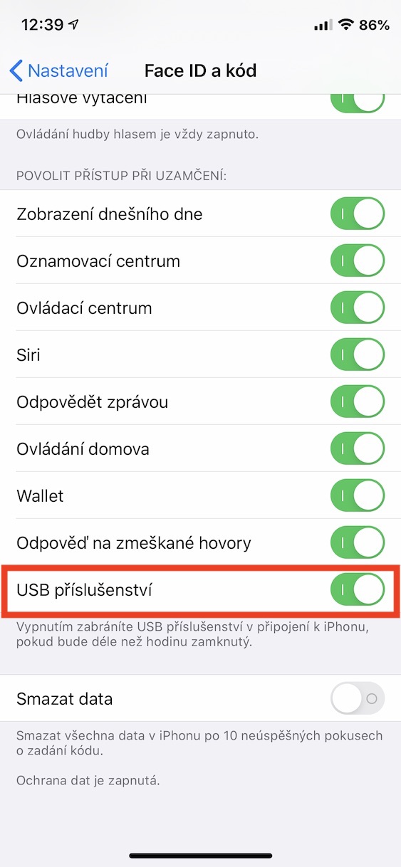 Pokud necháte váš iPhone připojený k USB, tak jej vystavujete nebezpečí. Právě připojením USB se může uživatel „dostat“ do iPhonu. Pokud takto připojený iPhone necháte někde položený, tak by toho mohl kdokoliv zkušený zneužít. Zároveň je nutné, abyste na vašem iPhonu aktivovali bezpečnostní opatření, které na uzamčené obrazovce zakáže připojení USB zařízení. Toho docílíte tak, že na iPhonu přejdete do nativní aplikace Nastavení, kde níže rozkliknete možnost Face ID a kódový zámek, popřípadě Touch ID a kódový zámek. Zde už poté stačí níže v sekci Povolit přístup při uzamčení deaktivovat možnost USB příslušenství.
