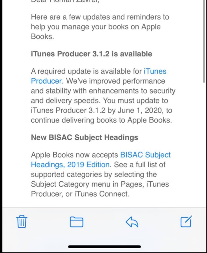 Apple nedávno vydal aktualizaci nástroje iTunes Publisher – jedná se konkrétně o verzi 3.1.2. Aktualizaci mohou vývojáři a autoři stahovat prostřednictvím platformy iTunes Producer, došlo v ní kromě jiného například k vylepšení výkonu a stability, stejně jako rychlosti a zabezpečení. Vývojáři a autoři, kteří chtějí i nadále distribuovat svá díla ve službě Apple Knihy, musí na novou verzi nástroje iTunes Publisher přejít nejpozději do 1. června letošního roku. Služba Apple Books rovněž přijala aktualizovanou verzi seznamu žánrových kódů BISAC Subject Headings. Jedná se o edici 2019, a autoři si mohou kompletní seznam kódů zobrazit v příslušném menu v nástroji iTunes Producer, případně ve službě iTunes Connect.