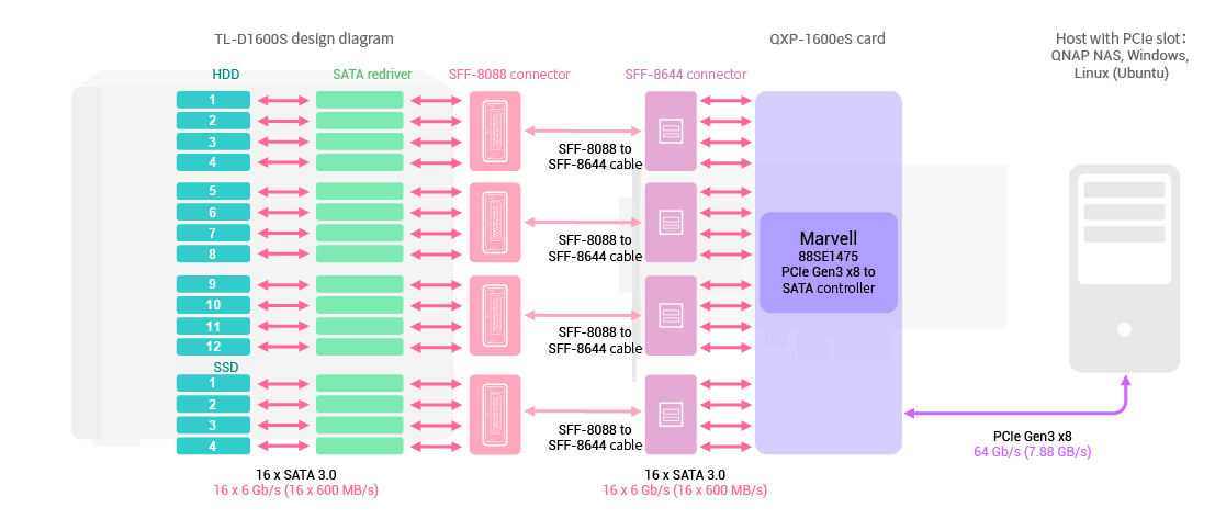 Řada TL SATA JBOD zahrnuje modely se stolním provedením (čtyřpozicový TL-D400S, osmipozicový TL-D800S, šestnáctipozicový TL-D1600S) a s montáží do racku (čtyřpozicový TL-R400S, dvanáctipozicový TL-R1200S-RP), které podporují vícenásobný datový přenos SATA 6Gb/s. Řada SATA JBOD je navržena tak, aby byl každý datový přenos SATA přímo připojen k jedné jednotce SATA, což výrazně zvyšuje výkon rozšiřující jednotky na vysokorychlostní a hospodárné řešení rozšíření úložiště. Řada JBOD je připravena k použití s dodanými rozšiřujícími kartami QXP a kabely. Rozšiřující kartu QXP lze nainstalovat do slotu PCIe QNAP NAS nebo počítače s Windows/Linux (Ubuntu) a přidat tak více připojení SATA 6Gb/s a jeden kabel SFF-8088 poskytuje přenosovou rychlost až 24 Gb/s (4 x SATA 6Gb/s). Přenosová rychlost mezi hostitelem a JBOD může při použití více kabelů dosáhnout až 64 Gb/s.