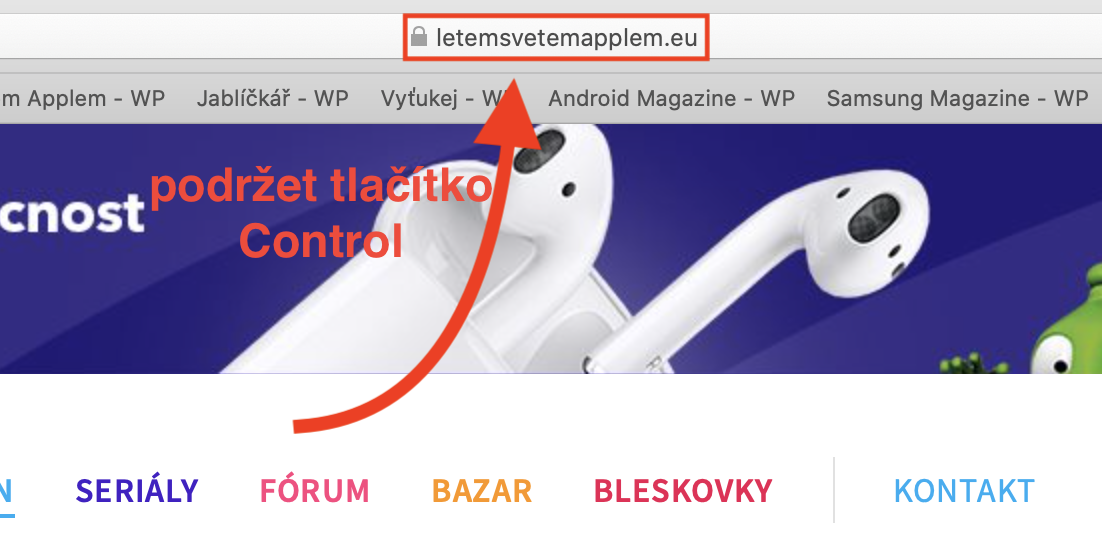V případě, že chcete na určité stránce v Safari deaktivovat blokátor reklamy, tak se na ni prvně přesuňte. Jakmile tak učiníte, tak podržte na klávesnici tlačítko Control. S podrženým tlačítkem Control se kurzorem přesuňte do horního řádku pro adresu, a poté na název stránky, na níž se nacházíte, klepněte. Nyní můžete klávesu Control pustit a z menu, které se zobrazilo, vyberte možnost Nastavení pro tuto webovou stránku… Poté se zobrazí malé okno, ve kterém už jen jednoduše stačí odškrtnout druhou možnost shora, kterou je Zapnout lokátory obsahu. Stránka se poté obnoví a je hotovo. Tímto jste na konkrétní webové stránce úspěšně nastavili, že na ni nebude blokována reklama.