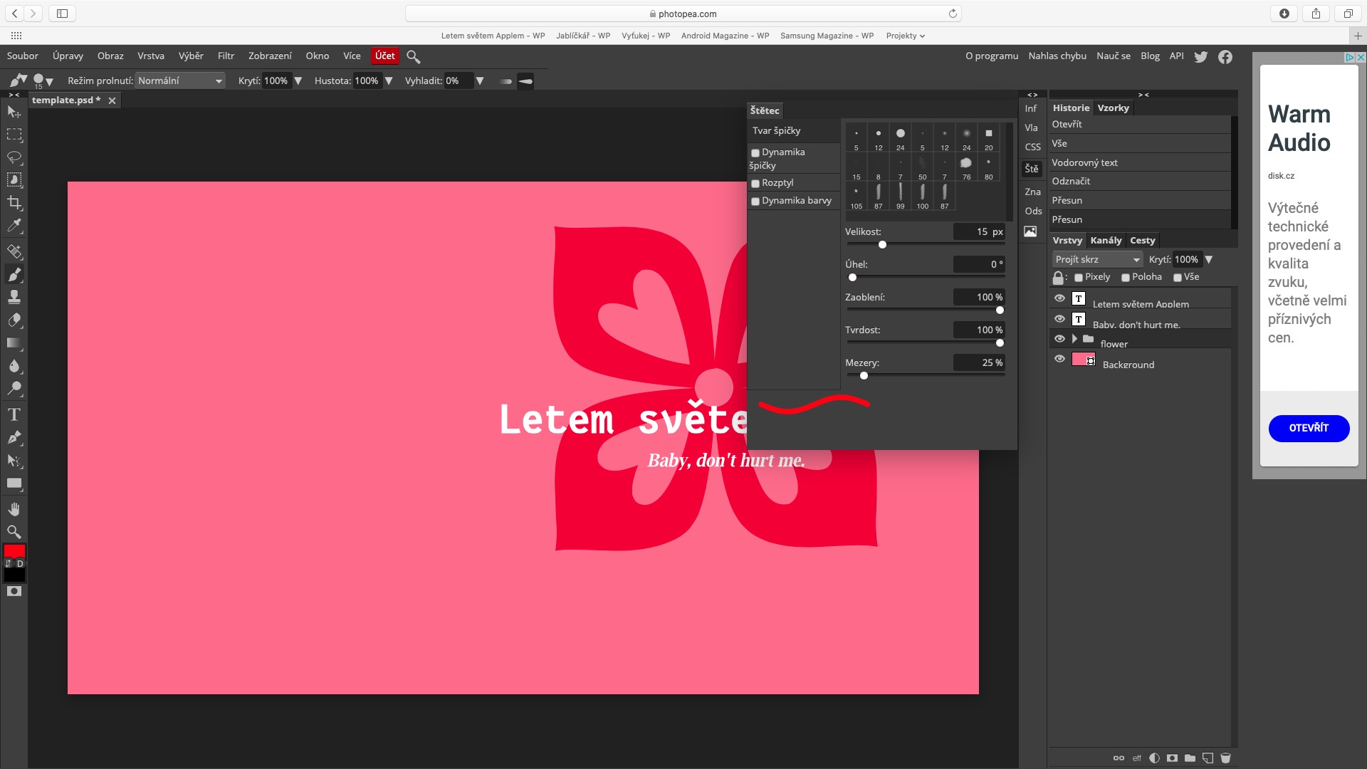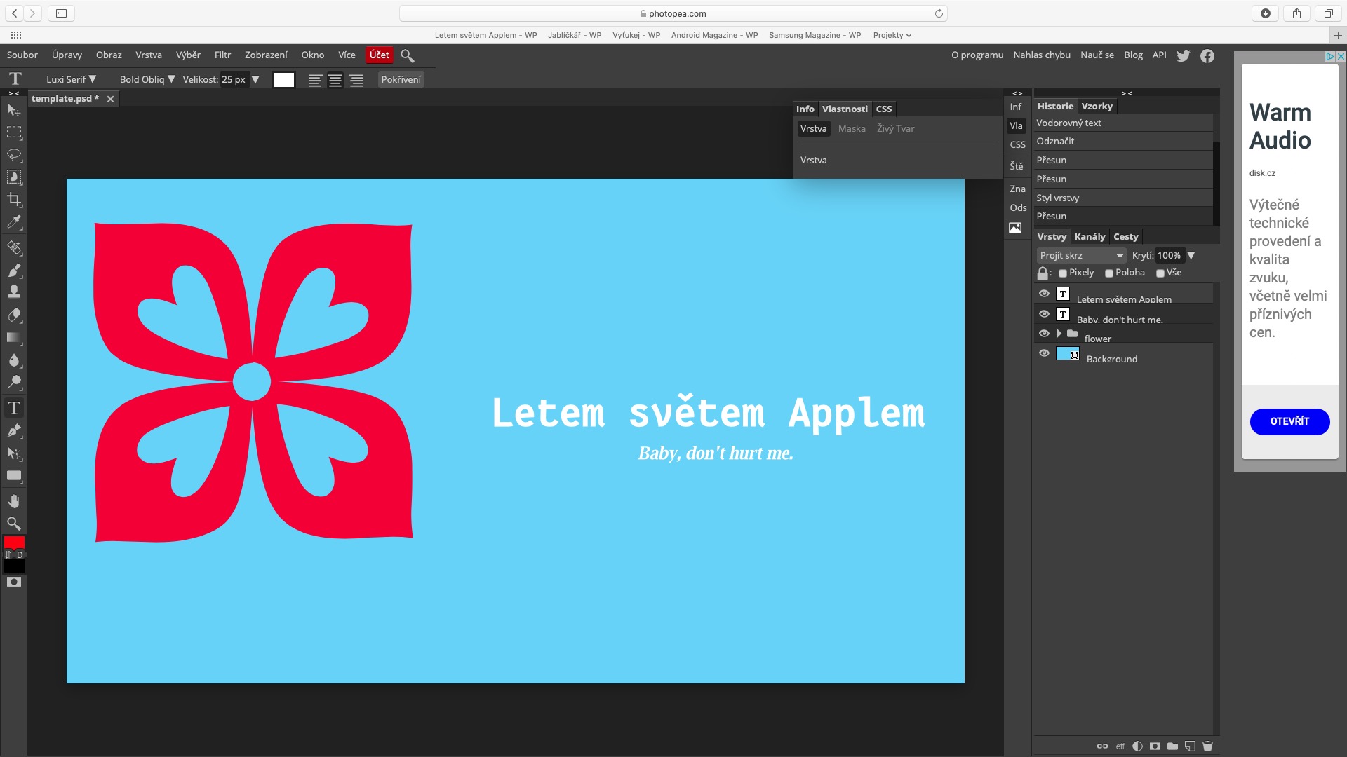 Pokud už jste někdy měli tu čest Photoshop od Adobe otevřít, tak vám prostředí aplikace Photopea rozhodně nebude cizí. Poté, co na stránku přejdete, tak si můžete ihned buď vytvořit úplně nový projekt, anebo nějaký naimportovat. V levé části obrazovky se nachází panel s nástroji (nechybí laso, záplata, anebo třeba text), v horní části poté najdete různé záložky pro filtry, práci s vrstvami, obrazem a další. V pravé části poté naleznete možnost pro zobrazení historie úprav, společně s důležitým oknem pro zobrazení všech vrstev. Nutno podotknout, že v rámci aplikace Photopea můžete využít také klávesové zkratky, jenž se opět nápadně podobají Photoshopu.