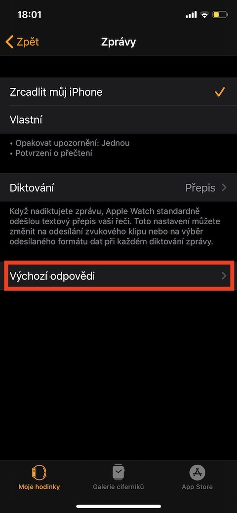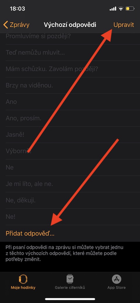 Jistě jste si stihli všimnout, že pokud vám na vaše Apple Watch přijde textová zpráva, můžete k rychlé odpovědi využít některou z přednastavených možností. Kromě emotikonu nebo psaní odpovědi na displeji svých hodinek můžete vybrat některou z předem připravených zpráv. Věděli jste ale, že si tyto výchozí odpovědi můžete přizpůsobit na míru? Stačí na iPhonu v aplikaci Watch zvolit Zprávy -> Výchozí odpovědi. V pravém horním rohu pak klepněte na „Upravit“ a poté už můžete měnit pořadí jednotlivých výchozích odpovědí, případě vybrané odpovědi z nabídky zcela vymazat. Pokud zcela dole klepnete na „Přidat odpověď“, můžete nastavit vlastní výchozí odpověď.