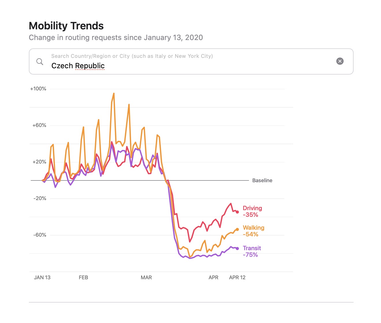 Data jsou volně přístupná přes webovou mikrostránku Mobility Trends Reports, na které lze přes vyhledávač prozkoumat využívání pěší navigace, autonavigace či navigace pro veřejnou dopravu v Apple Mapách. Tímto způsobem si lze prohlédnout data z celé řady států a měst, přičemž na seznamu nechybí ani Česká republika. V jejím grafu se brutálně promítla omezení pohybu nařízená vládou na začátku března, která srazila využívání Apple Maps pro vyhledávání veřejné dopravy o 75 %, pro chodce o 54 % a pro řízení vozů o 35 %. Nicméně se zlepšující se situací na našem území se využitelnost všech tří aspektu opět pomalu zvedá, byť k normálu má stále na míle daleko.
