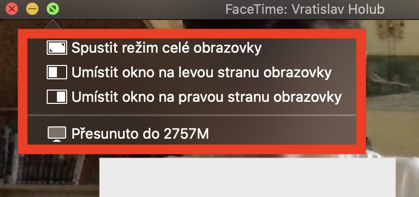 Pokud máte velký displej vašeho Macu, anebo máte připojený druhý, externí displej, tak můžete jednoduše okno FaceTime přenášet mezi těmito monitory, anebo okno můžete jednoduše umisťovat do levé či pravé části obrazovky. Tato nastavení můžete jednoduše zobrazit tak, že se přesunete do aktivního okna aplikace FaceTime, a poté podržíte kurzor na zeleném kolečku v levém horním rohu. Po chvilce se zobrazí menu, ve kterém už lze jednoduše zvolit, zdali chcete okno přenést na jiný monitor, na celou obrazovku, anebo do levé či pravé části obrazovky. To se hodí tehdy, pokud chcete rychle s oknem FaceTime pracovat a přenášet jej.