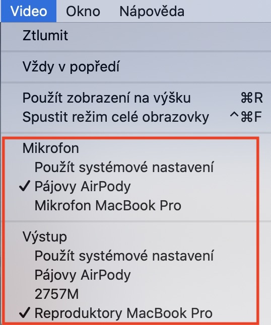 Osobně se při video hovorech na Macu přes FaceTime často přepínám mezi vstupy a výstupy zvuku. Tehdy, když jsem doma sám, tak mám hovor nastavený na reproduktory, jakmile se však například přítelkyně dívá ve stejném pokoji na televizi, tak ji samozřejmě nechci rušit a přepnu se na AirPody. Ve většině případech však u probíhajícího hovoru nedochází k automatické změně vstupu či výstupu, takže je musím měnit ručně. V tomto případě stačí, abyste se přesunuli do aktivního okna aplikace FaceTime, a poté v horní liště klepnuli na možnost Video. V menu, které se zobrazí, už poté jen stačí vybrat vstup a výstup, který chcete použít, a poté na něj klepnout. Změny se projeví během několika málo sekund.