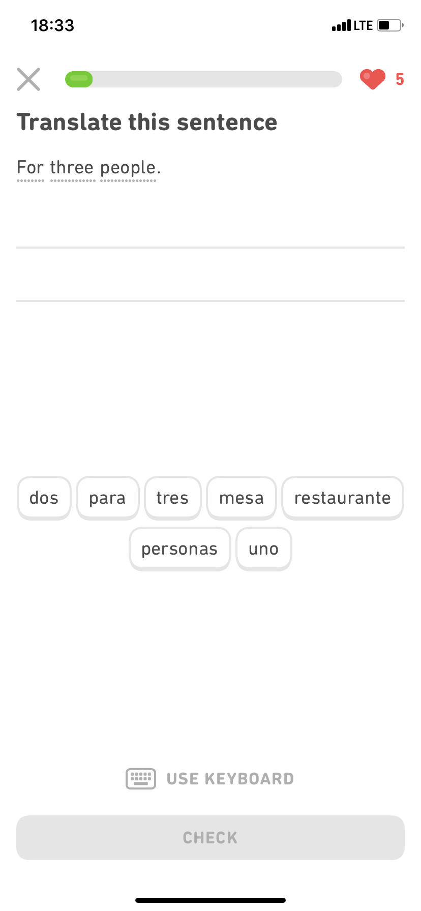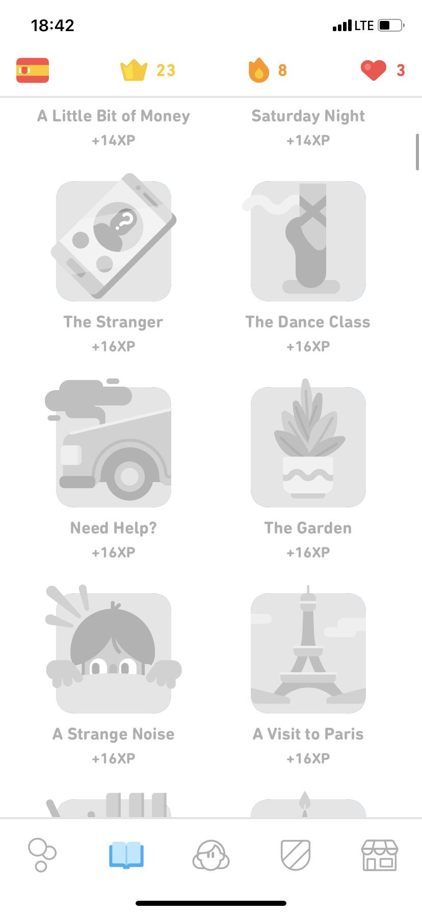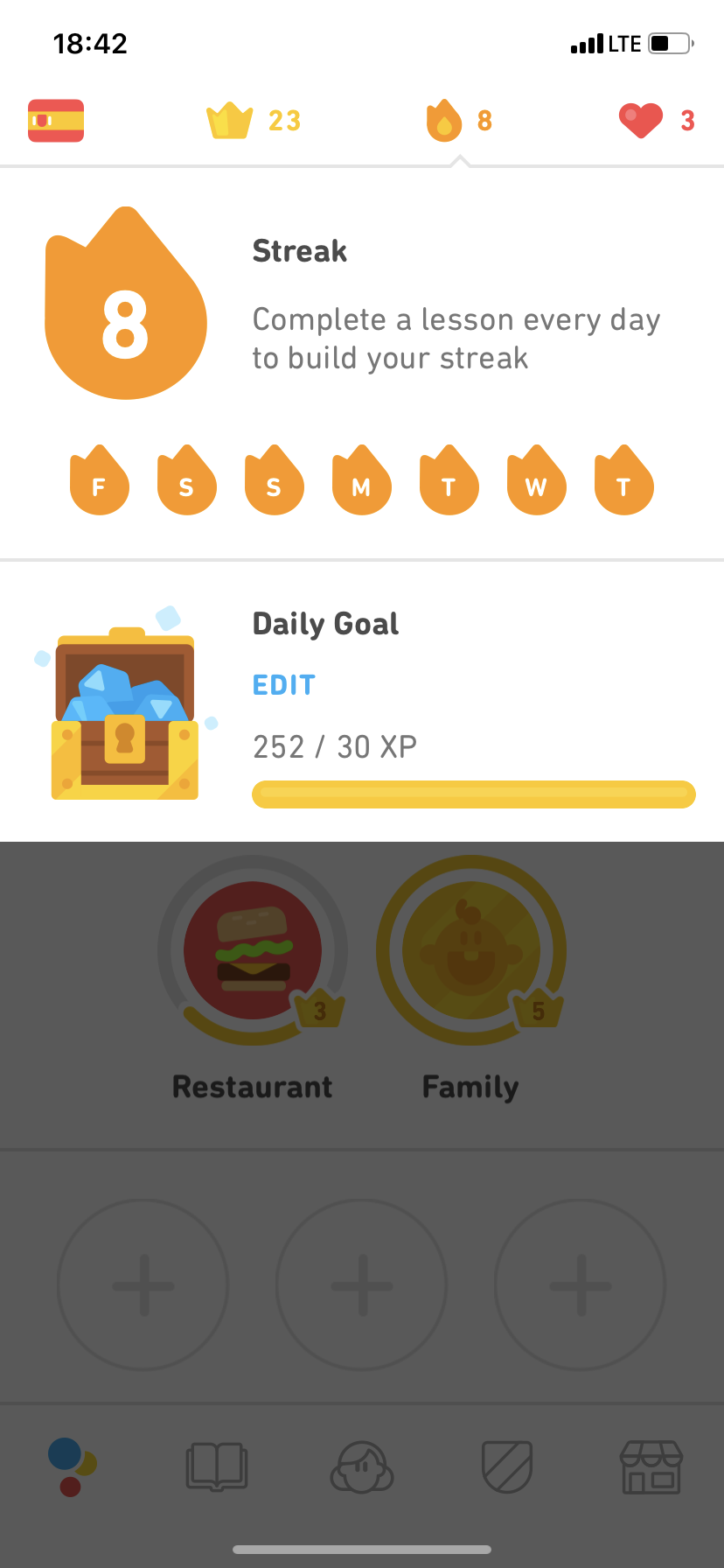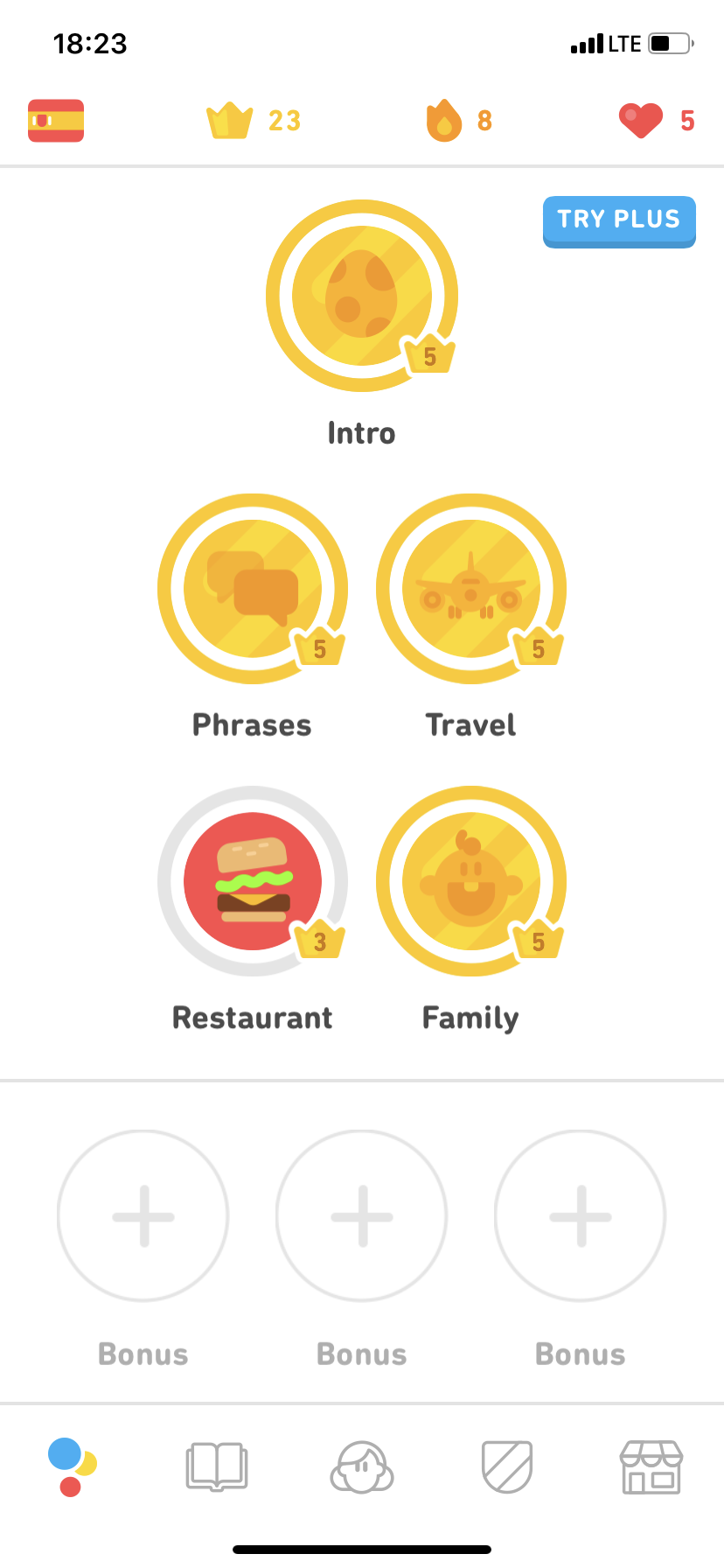 Já se rozhodl pro studium španělštiny v angličtině. S úsměvem musím dodat, že mě k tomu přiměl seriál La Casa de Papel, což byl zřejmě jediný moment, kdy jsem o tento jazyk v životě „zavadil“. Po zvolení konkrétního jazyka budete dotázáni, jste-li naprostí začátečníci, nebo zda už máte s jazykem nějaké zkušenosti. Pokud zvolíte první možnost, objevíte se v menu, kde máte různé kapitoly. Jejich absolvováním se vám otevřou kapitoly další, a vy se tak budete ve studiu zlepšovat. Jste-li pokročilý, budete mít většinu levelů odemklou. Alfou a omegou všeho jsou srdíčka, kterých máte maximálně 5. Jakmile uděláte během kapitoly chybu, jedno srdíčko vám zmizí. Pokud o tyto životy během lekce přijdete, můžete je doplnit utracením diamantů, jenž získáváte za splněné lekce a achievementy. Pokud tyto diamanty nemáte, musíte lekci ukončit. V tomto případě se nabízí možnost udělat „Praktickou lekci“. Jde o lekci, ve které budete odpovídat na již probrané učivo. Jde tedy o příjemnou formu opakování, ve kterém se na chyby nehraje. Jakmile test vyhotovíte, získáte srdíčko. V drtivé většině případů vám bude nabídnuto další za zhlédnutí reklamy. Poté je zde ještě možnost tzv. „Duolingo Plus“, které je na 7 dní zdarma a láká na absenci reklam a neomezený počet životů. Další možností je dokupování krystalů.