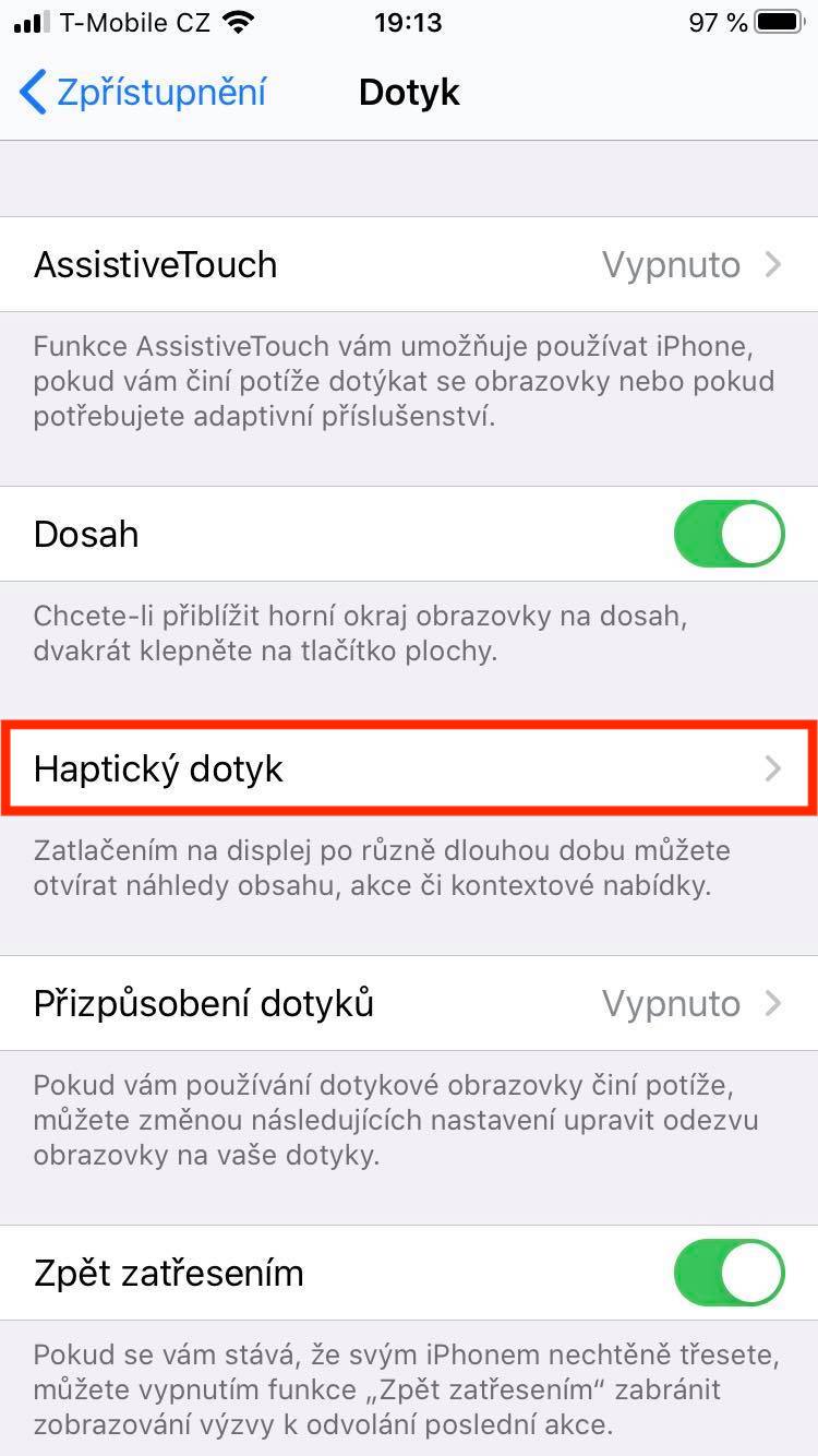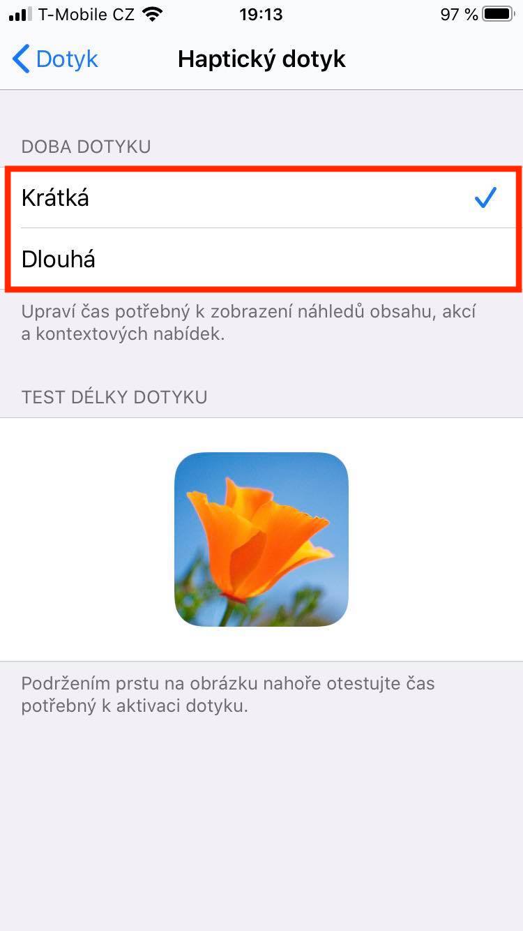 iPhone XR byl vůbec prvním iPhonem, který po několika letech nepřišel s funkcí 3D Touch, díky které byl displej schopen reagovat na sílu jeho stisku. Mnoho uživatelů tento krok kritizuje, nám však ale nezbudou nic než oči pro pláč, jelikož se návratu 3D Touche na iPhony jednoduše nedočkáme. 3D Touch byl počínaje iPhone XR a řady s označením 11 nahrazen funkcí Haptic Touch. Tato funkce nereaguje na sílu stisku displeje, ale na to, jak dlouho prst na displeji podržíte. Z vlastní zkušenosti ale mohu potvrdit, že se na Haptic Touch dá zvyknout a po chvíli používání vám už 3D Touch chybět nebude. Pokud si chcete změnit nastavení délky stisku Haptic Touch, tak se přesuňte do Nastavení -> Zpřístupnění -> Dotyk -> Haptický dotyk, kde si délku stisknutí upravte.