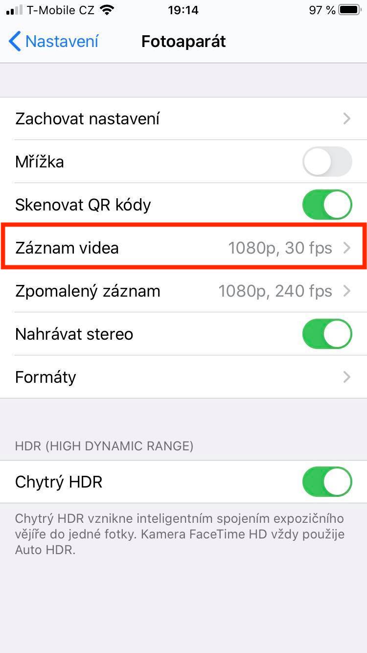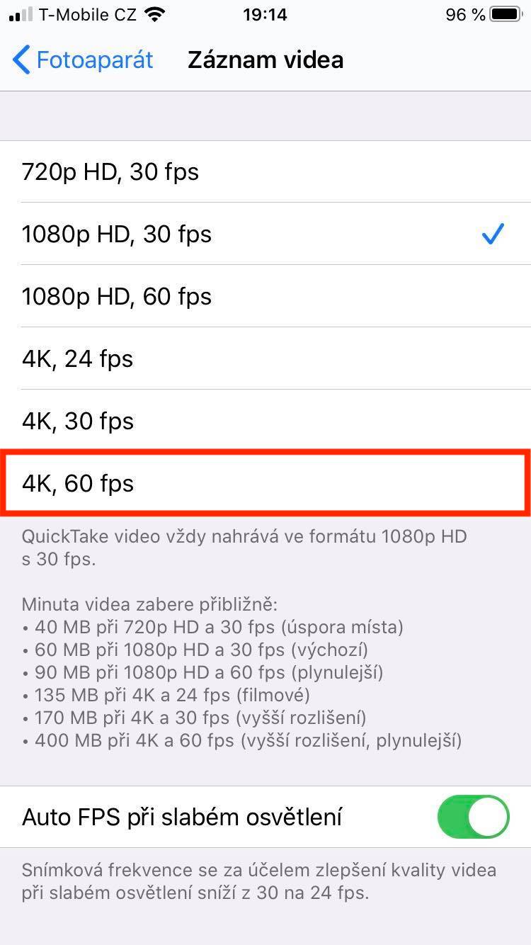 I přesto, že se iPhone SE (2020) velmi podobá iPhonu 8, tak po stránce fotoaparátu jsme se dočkali velkých vylepšení. Nový iPhone SE je, tedy co se fotoaparátu týče, blíže iPhonu 11. Vysoce kvalitní fotografie jsou tedy prakticky zaručeny. Objektiv iPhonu SE (2020) je schopen nahrávat video až v rozlišení 4K při 60 snímcích za sekundu. Nutno podotknout, že ve výchozím nastavení je zvoleno nahrávání v 1080p při 30 FPS. Pokud chcete tohle nastavení změnit, tak se přesuňte do Nastavení -> Fotoaparát -> Záznam videa, kde si formát videa vyberte.