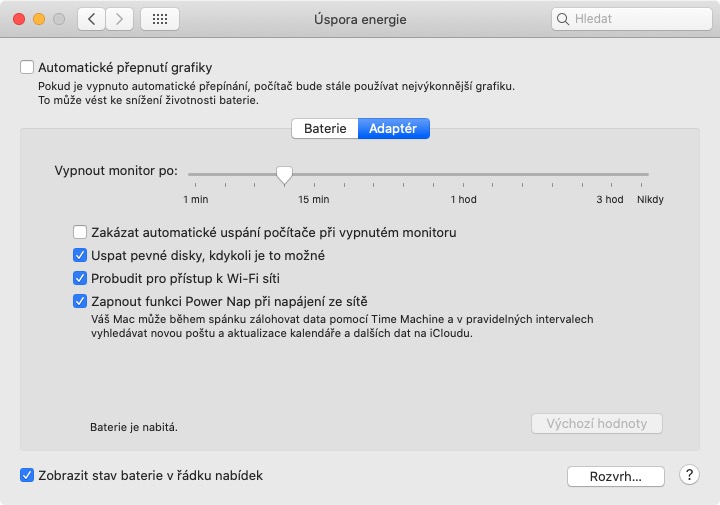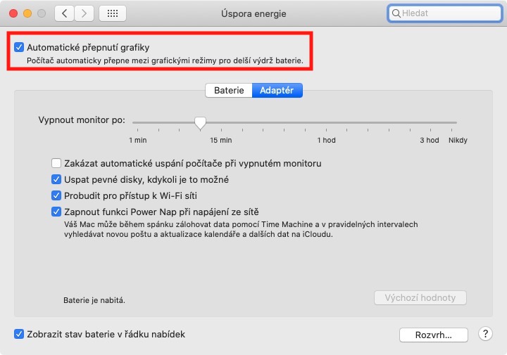 Dalším z problémů, které 16″ MacBook Pro trápí, jsou zamrzávající macOS a popřípadě jeho úplně zhroucení a restartování. Nejčastěji se tato chyba projeví tak, že se celý MacBook zasekne a po dobu několika sekund zůstává nečinný. Nefunguje Touch Bar, klávesnice, trackpad – jednoduše řečeno nic. Po chvíli obrazovka MacBooku zčerná, na okamžik se ventilátory roztočí na plný výkon (tzv. turbo – vtip), a poté dojde k restartu systému. Uživatel takto může přijít o veškerou neuloženou práci. V některých případech pomáhá pro vyřešení tohoto problému deaktivace integrované grafické karty, kdy MacBook bude využívat pouze dedikovanou GPU. Deaktivaci integrované grafické karty provedete tak, že otevřete Předvolby systému, a poté v okně vyberete sekci Úspora energie. Zde už jen stačí nahoře odškrtnout možnost Automatické přepnutí grafiky. Osobně mi však bohužel tento fígl nepomohl a byl jsem nucen můj první 16″ MacBook Pro reklamovat. U nového kusu už se tyto „anomálie“ nedějí.