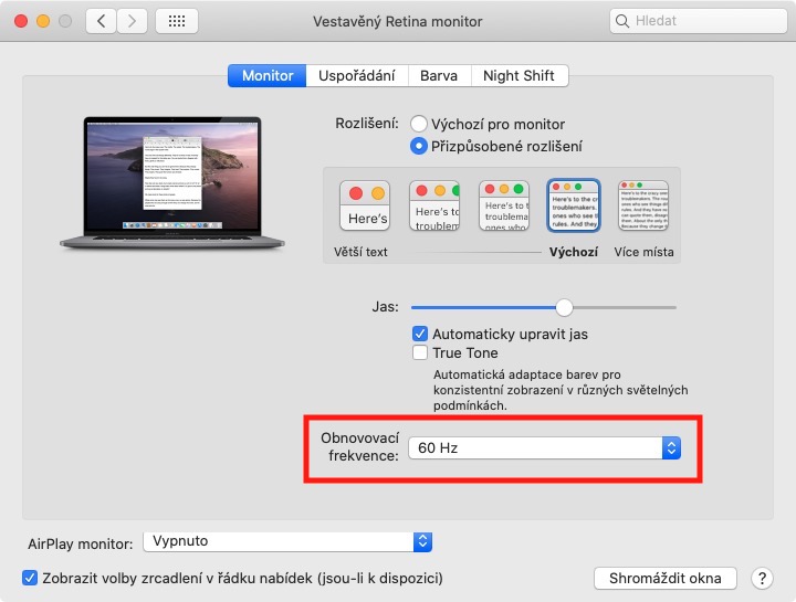 Asi nejméněkrát se na diskuzních fórech věnovaných 16″ MacBooku Pro objevuje problém s tzv. ghostingem displeje. V tomto případě se na monitoru MacBooku objevují tzv. duchové – tedy kdykoliv pohnete s nějakým prvkem, tak se za ním vytvoří jakýsi stín či duch. Bohužel, v tomto případě se nejspíše nejedná o úplnou vadu displeje, ale jeho vlastnost. Jediné, co v tomto případě můžete udělat, je přejít do Předvoleb systému, kde se přesuňte do sekce Monitory. Zde se poté v horním menu přesuňte do záložky Monitor a společně se stisknutým tlačítkem Option klepněte na možnost Přizpůsobené rozlišení. Níže si poté vyberte jinou, než výchozí obnovovací frekvenci a vyzkoušejte, zdali ghosting pozorujete i nyní. Pokud ne, tak jen dobře pro vás, v opačném případě budete muset MacBook buď vrátit, anebo si jednoduše zvyknout.