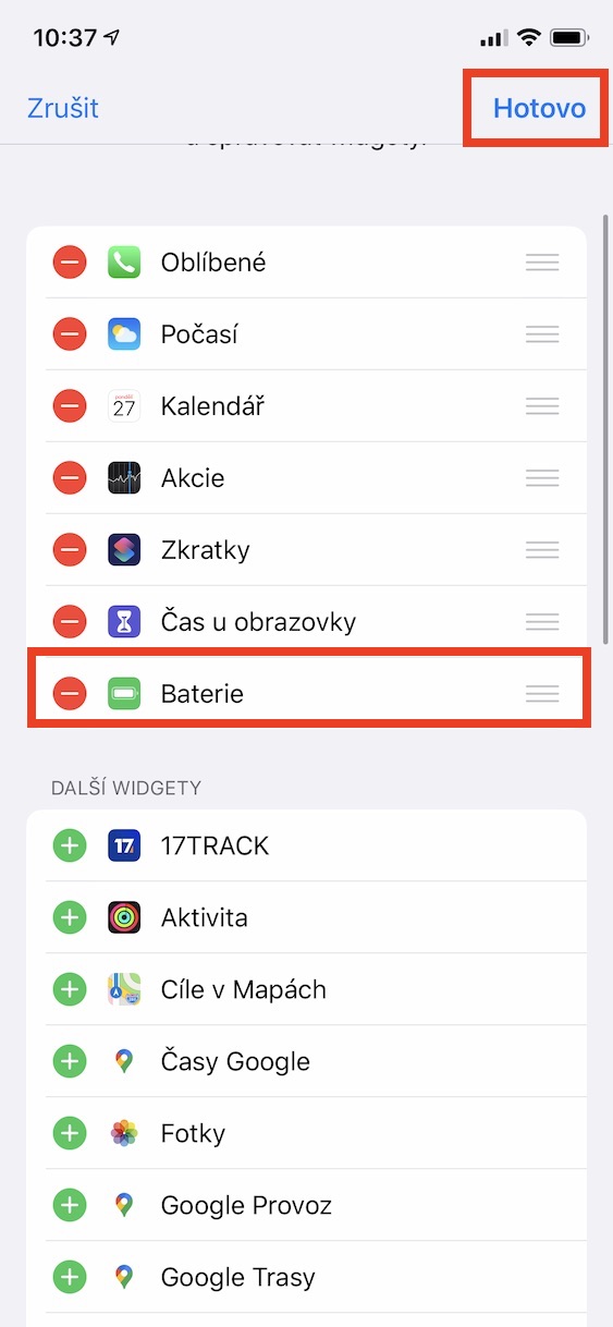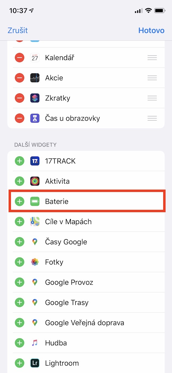 Pokud chcete na iPhonu či iPadu rychle a jednoduše zjistit stav zbývající kapacity baterie na připojených ovladačích (či jiných Bluetooth zařízeních), tak vaše zařízení prvně odemkněte, a poté se přesuňte na domovskou obrazovku. Jakmile tak učiníte, tak přejeďte na domovské obrazovce úplně doleva, dokud se neocitnete na ploše s widgety. Zde stačí, abyste sjeli úplně dolů, kde klepněte na tlačítko Upravit. Poté se ocitnete na stránce s názvem Přidejte widgety. Zde sjeďte opět o něco níže do sekce Další widgety, kde vyhledejte widget s názvem Baterie a klepněte u něj na zelené tlačítko +. Nakonec klepněte vpravo nahoře na Hotovo. Tímto jste úspěšně přidali widget s informacemi o bateriích.