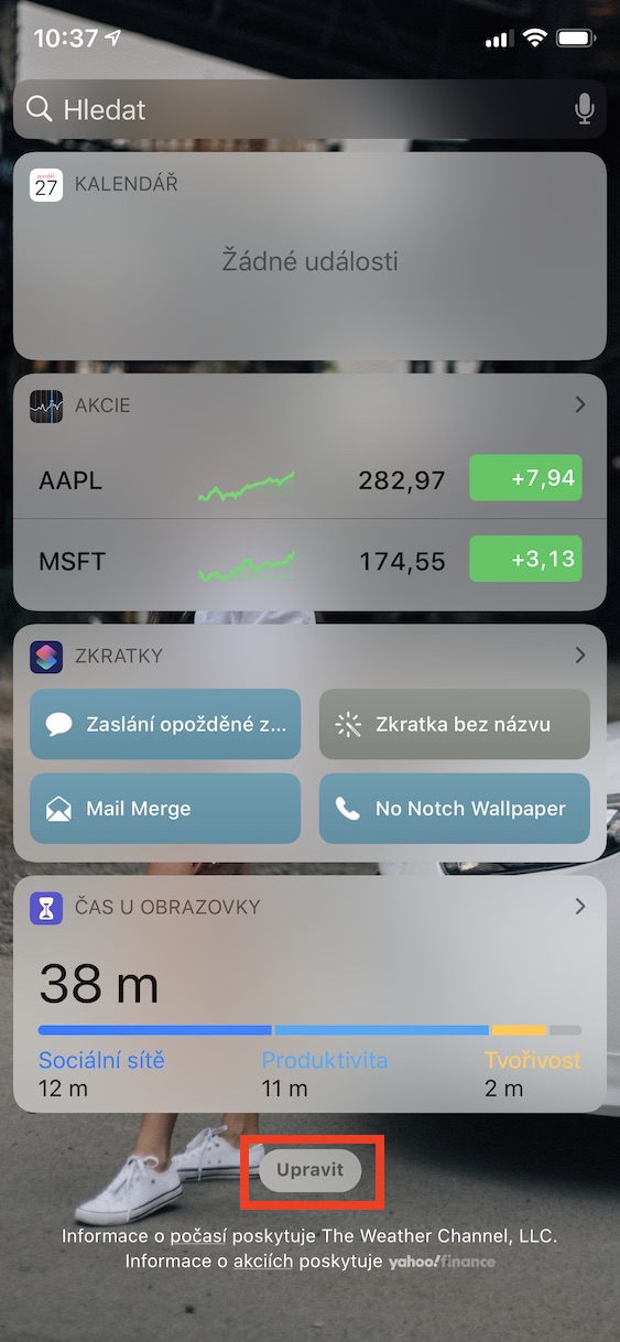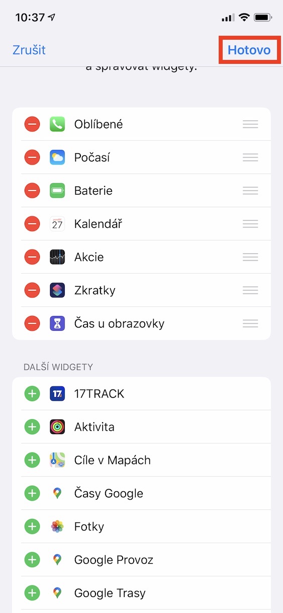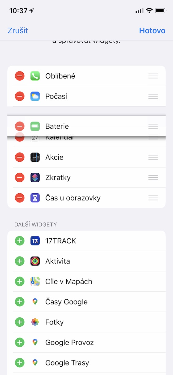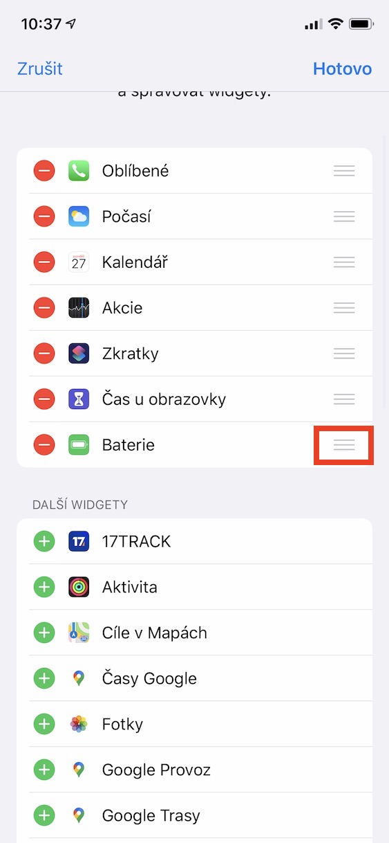 V případě, že byste si chtěli pořadí widgetů změnit, tak stačí, abyste se opět přesunuli na stránku Přidejte widgety (viz výše). Zde se poté v pravé části u přidaných widgetů nachází ikona tří čar. Pokud widget za tyto tři čáry chytnete, tak jej můžete jednoduše prstem přesouvat. Takto to udělejte se všemi widgety, u kterých chcete pořadí upravit, a nakonec klepněte vpravo nahoře na Upravit.