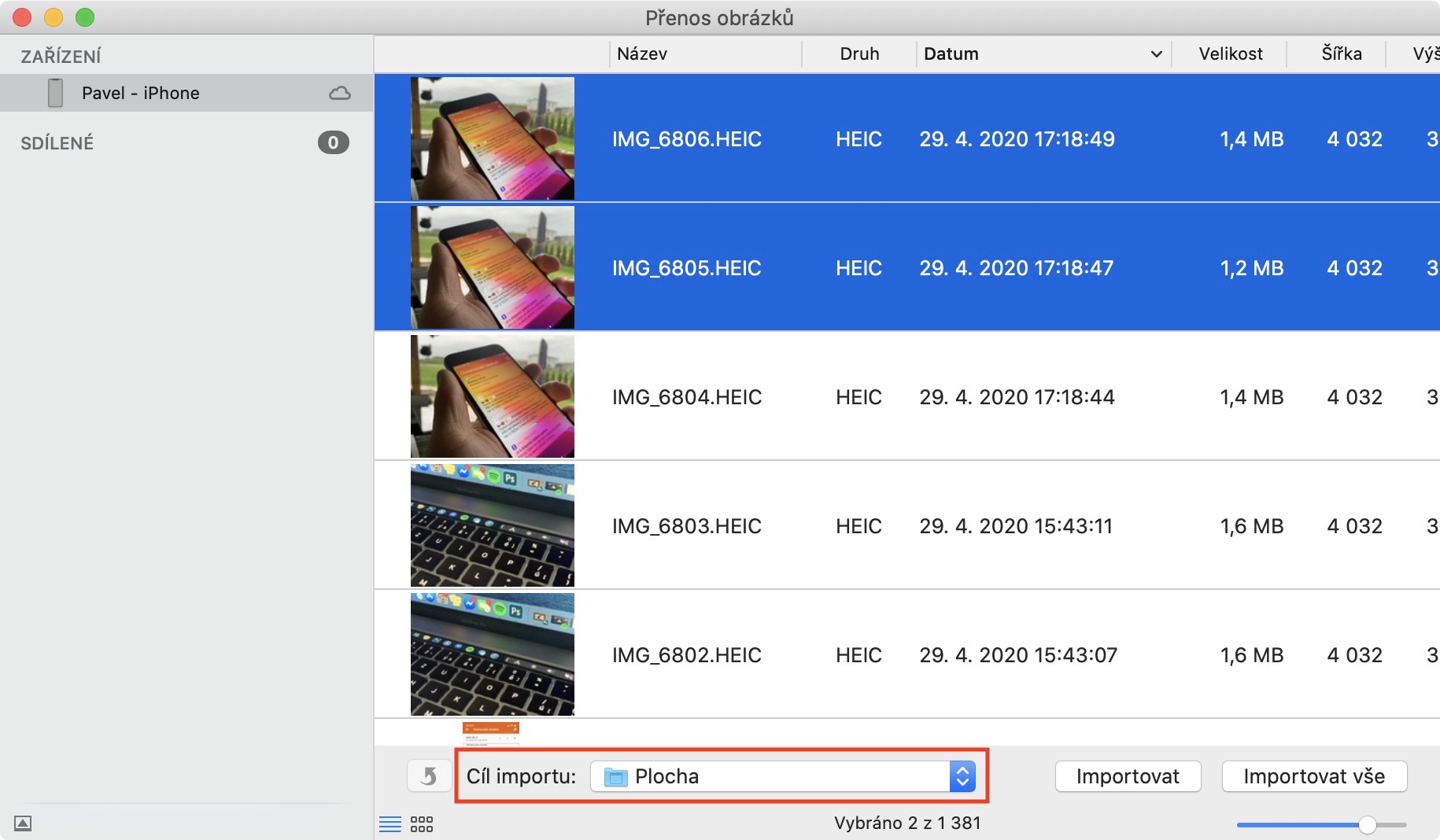 Po načtení fotografií už si stačí vybrat, které fotografie chcete exportovat. Pokud chcete exportovat jen některé fotografie, tak si je označte, níže zvolte destinaci pro uložení fotek, a poté klepněte vpravo dole na tlačítko Importovat. Vybrané fotografie se poté importují na místo, které jste zvolili. V případě, že chcete přenést veškeréfotografie najednou, tak si opět vyberte ve spodní části okna destinaci pro uložení fotek, a nakonec klepněte na Importovat vše. Jakmile se všechny fotografie úspěšně importují do Macu, tak můžete aplikaci Přenos obrázku zavřít a iPhone od Macu odpojit.