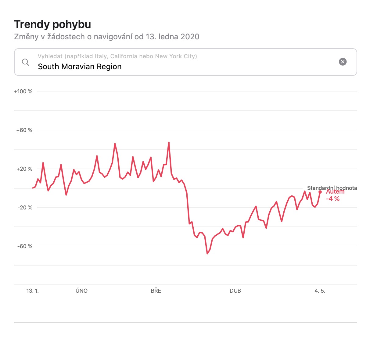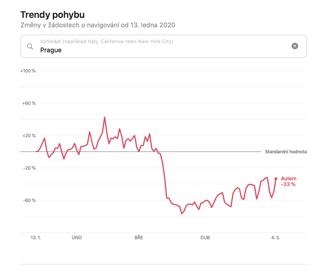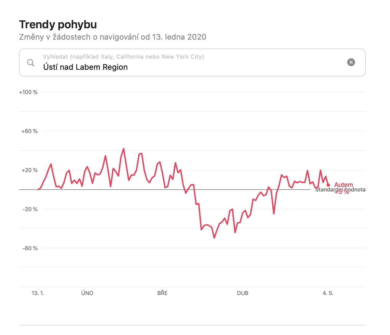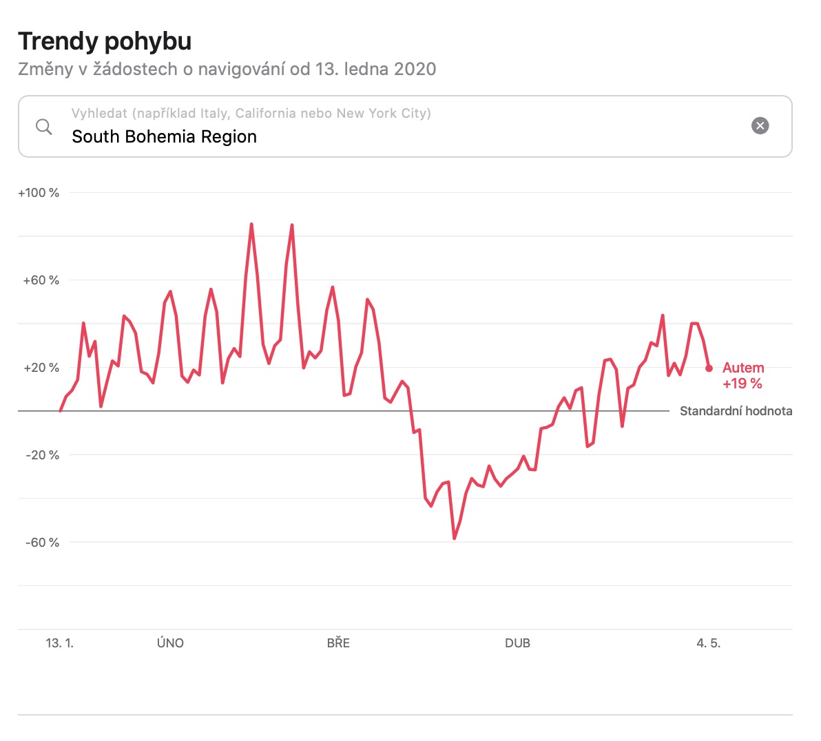 Není tomu tak dávno, co jsme vás informovali o nové mikrostránce Applu věnované pohybu jeho uživatelů v souvislosti s koronavirem. Veškerá data Apple anonymně získával z aplikace Apple Maps a to jen proto, aby ukázal, jak intenzivně uživatelé v největším rozpuku koronaviru cestovali – ať už pěšky, městskou hromadnou dopravou či automobily. Zprvu tato stránka odhalovala jen největší světové metropole a celostátní přehledy, nyní do ní pak přibyly i jednotlivé české a slovenské regiony. Díky tomu se tak můžete přesvědčit o tom, jak aktivně se obyvatelé vašeho kraje v uplynulých týdnech pohybovali.