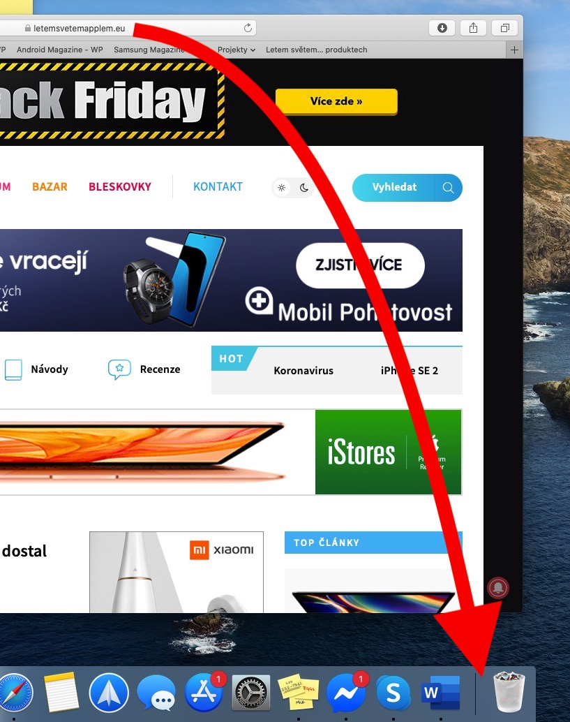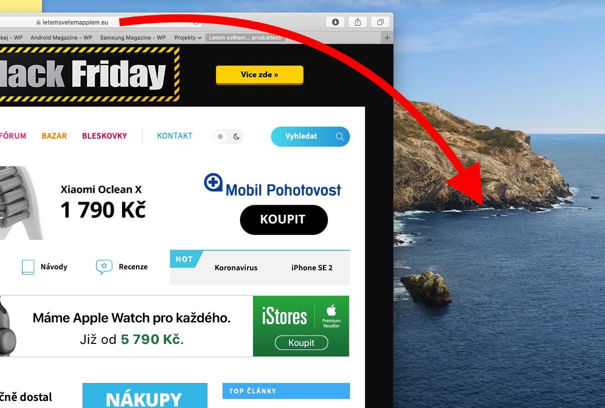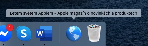 V případě, že si chcete přidat stránky LsA na plochu vašeho macOS zařízení, tak opět přejděte na stránky https://www.letemsvetemapplem.eu/. Poté si okno Safari zmenšete, chytněte v něm letemsvetemapplem.eu v adresním řádku a přesuňte jej směrem na plochu. Tímto se vám odkaz ze Safari objeví na ploše, odkud k němu budete mít rychlý přístup. Stejným způsobem si můžete na Macu LsA přidat i do Docku, konkrétně do jeho pravé části. Stačí do něj přetáhnout adresní řádek.